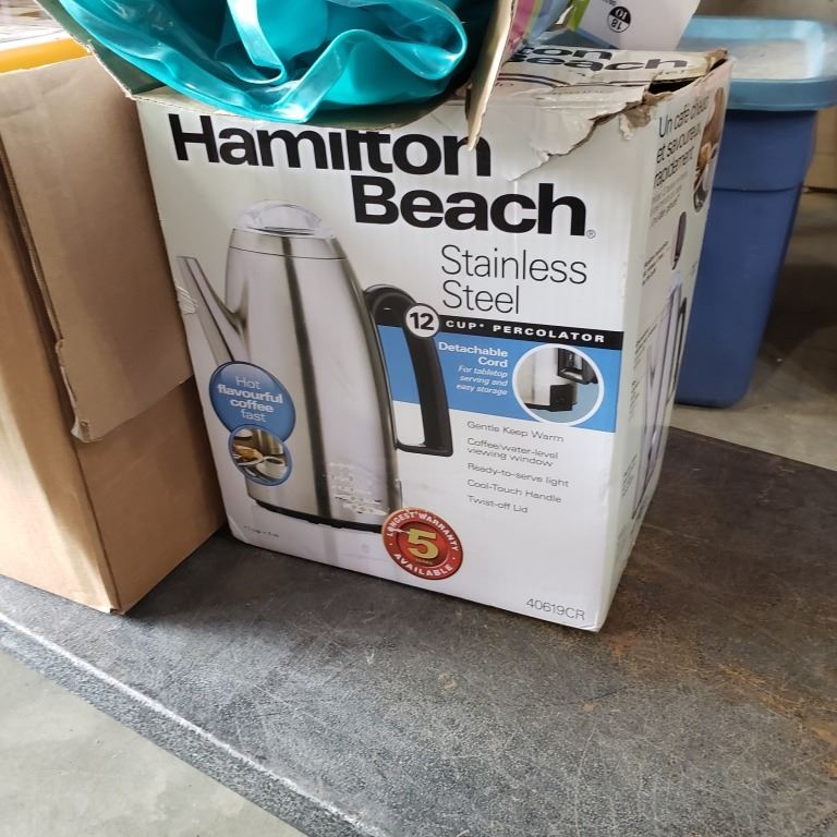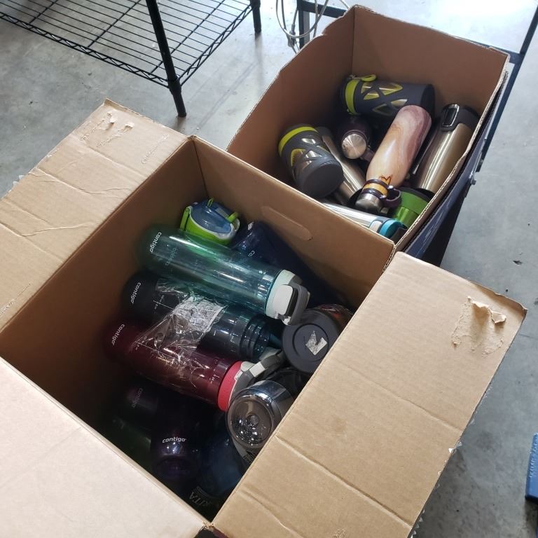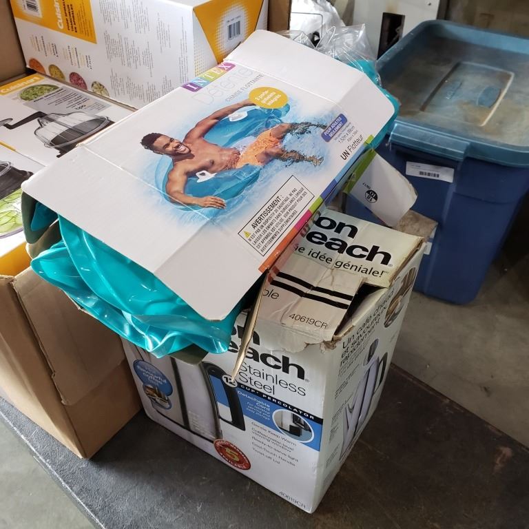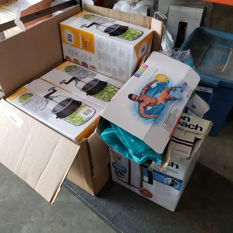 Box of food spiralizers, kettle and inflatable with box of water bottles