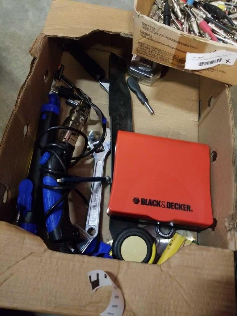 Box of lawn mower accessories, Black and Decker drill bit set and more