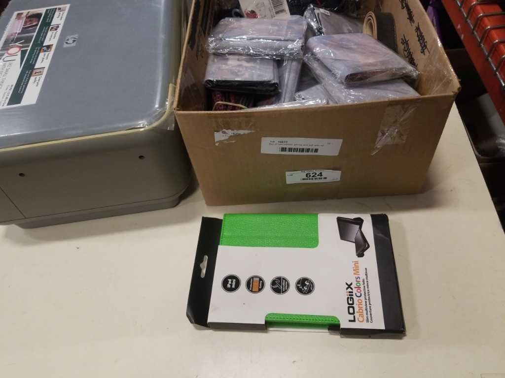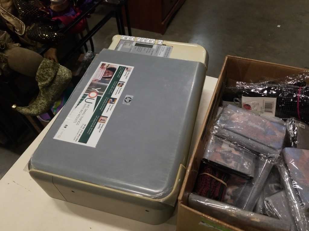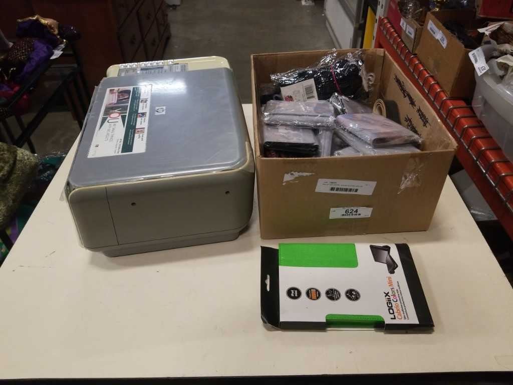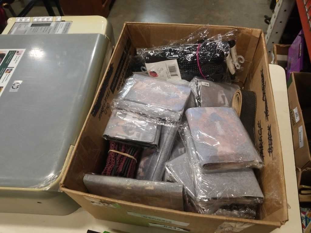 Box of new wallets, gloves and belt with HP printer