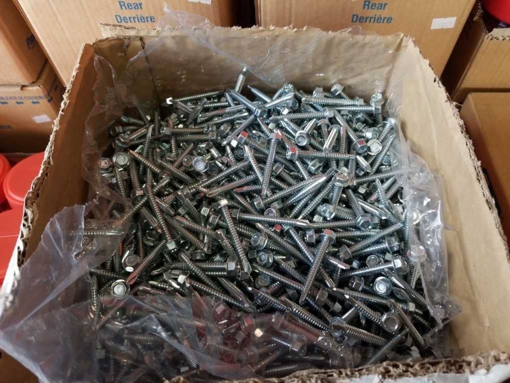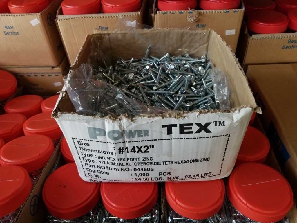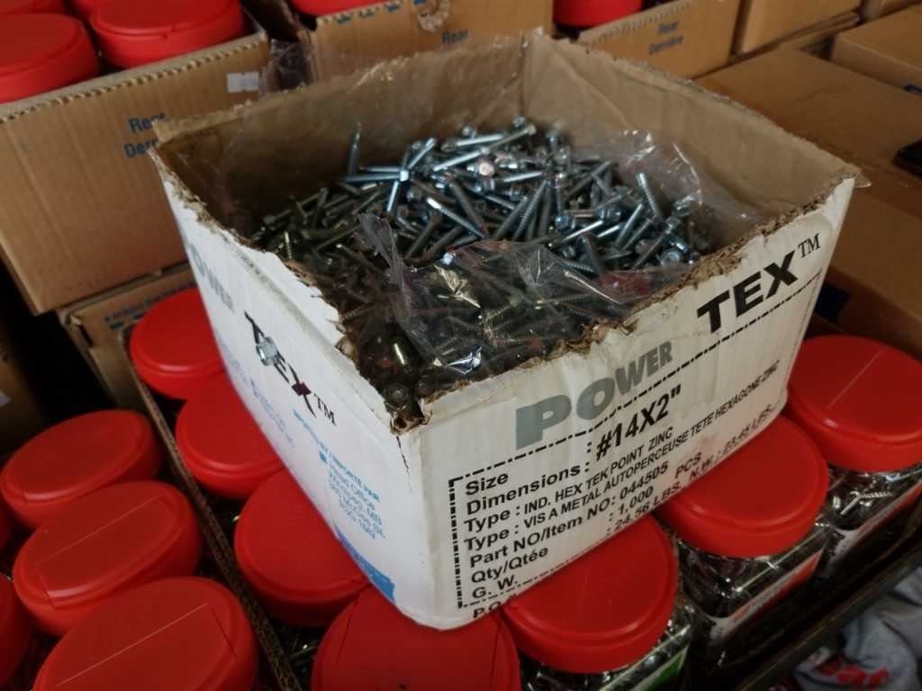 Box of number 14 by 2 inch hex head Tek Point zinc screws