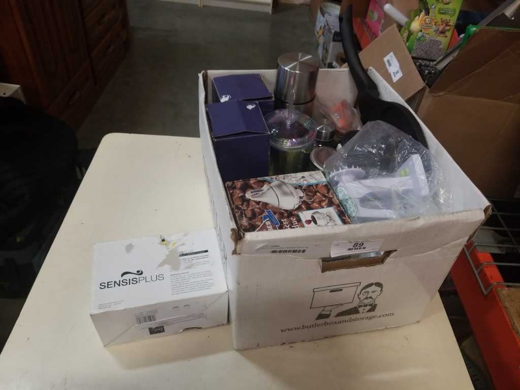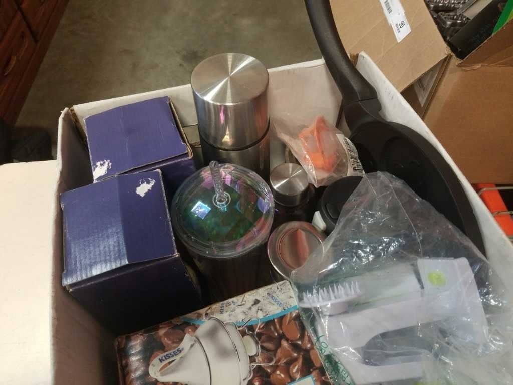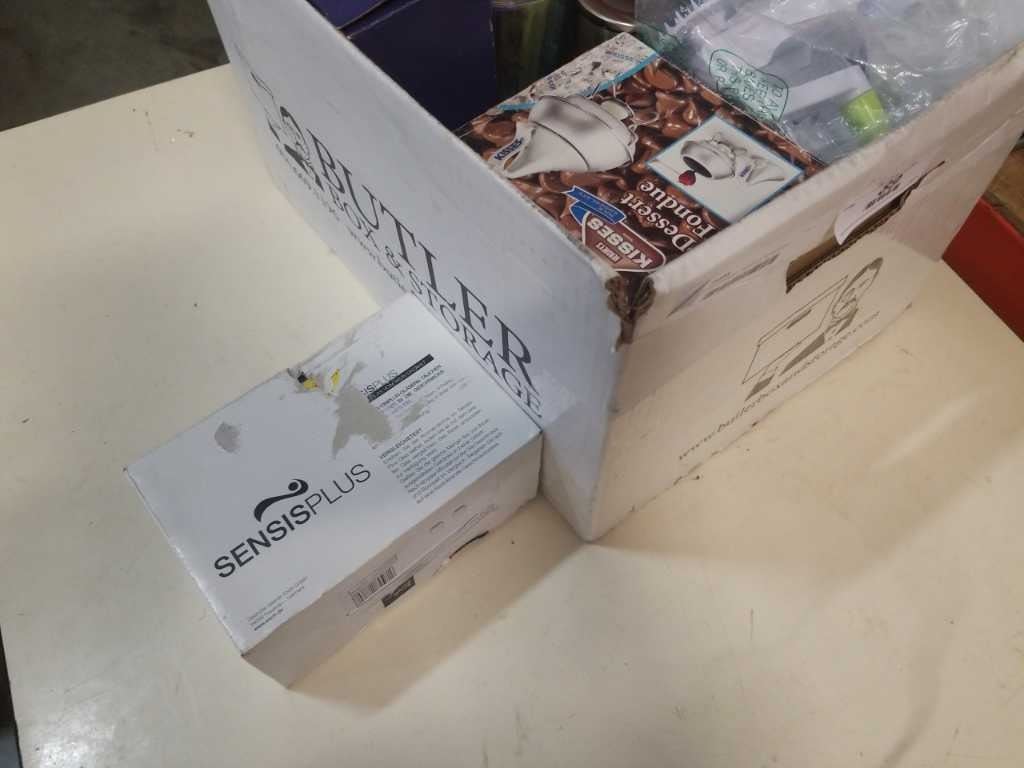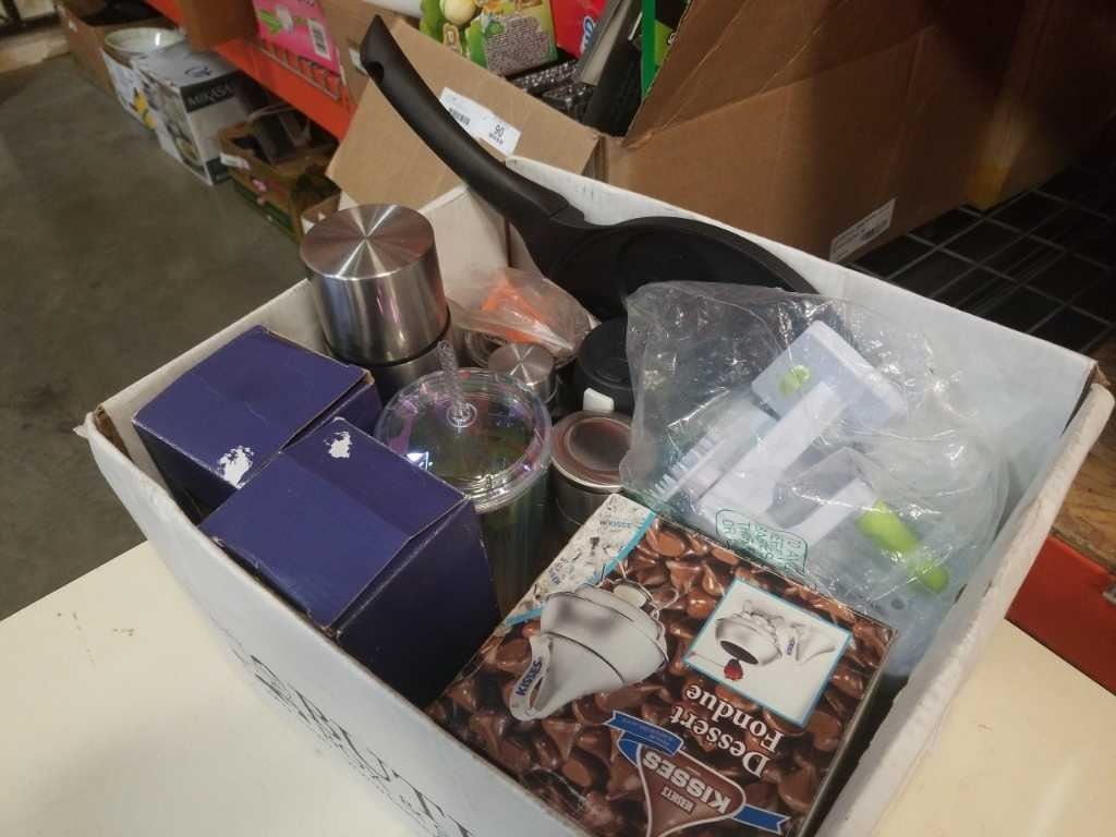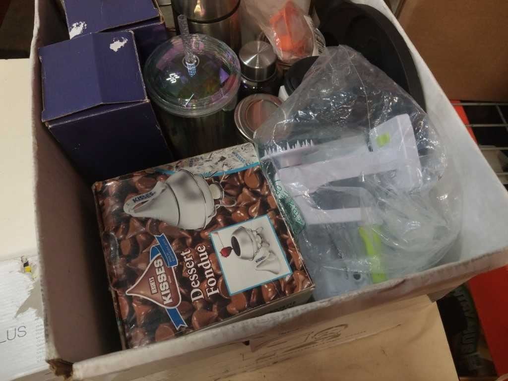 Box of slicer/peeler, hersheys fondue set, pancake pan, water bottles and more
