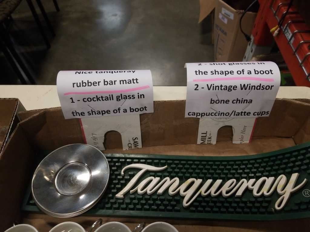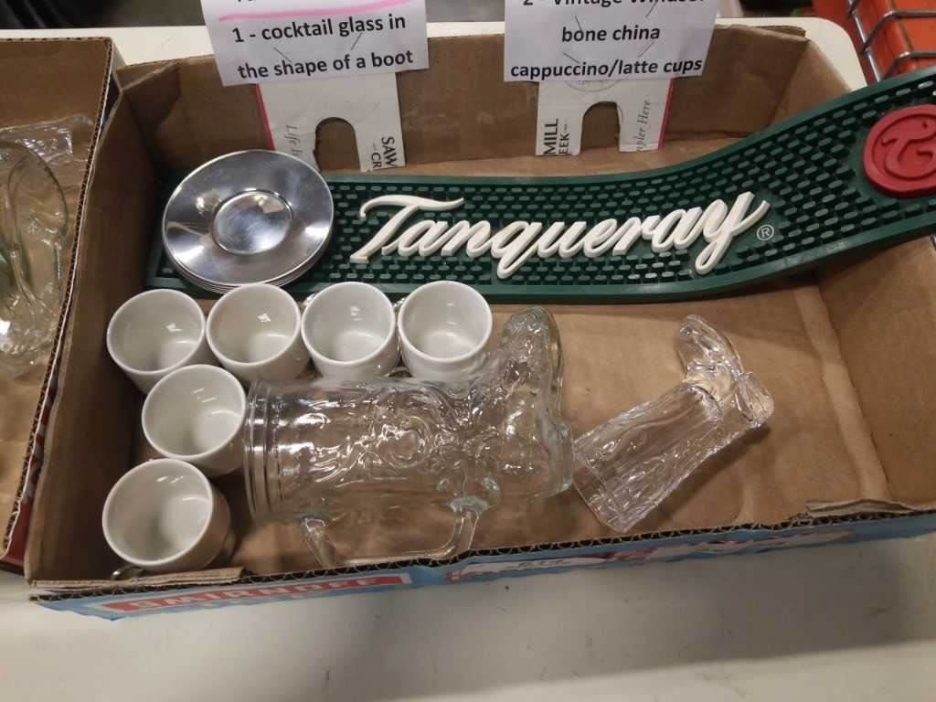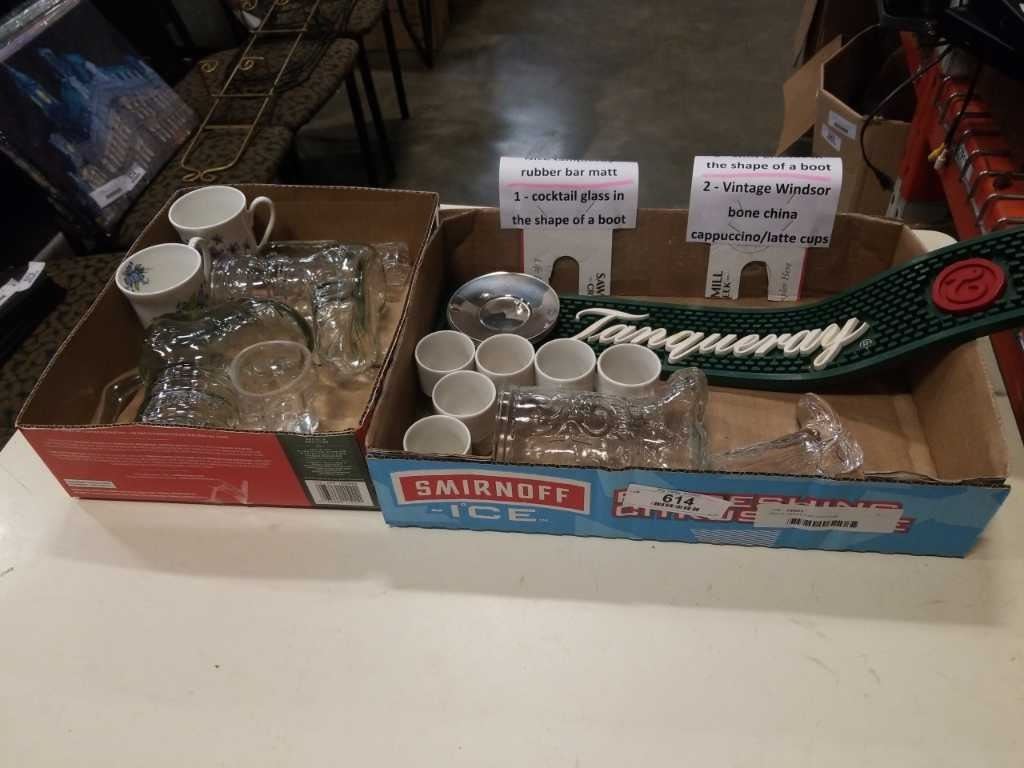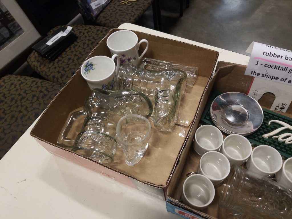 Box of various cups and mugs