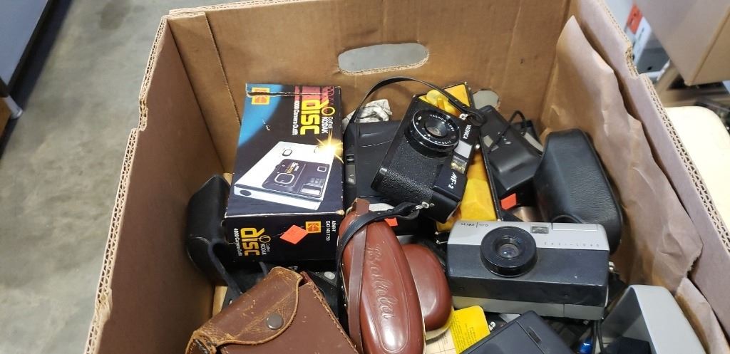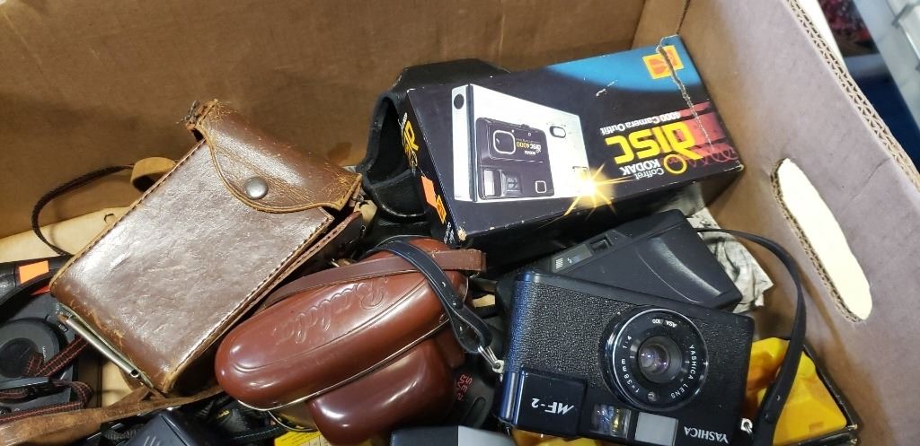 Box of vintage camera equipment