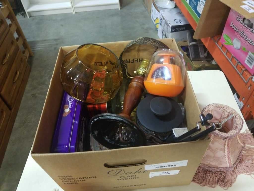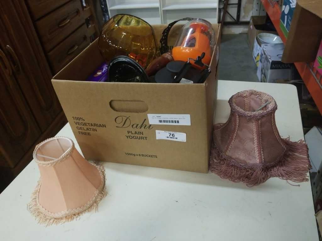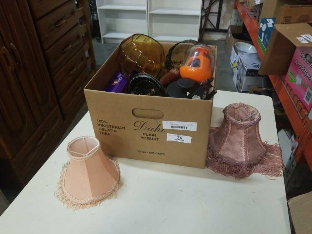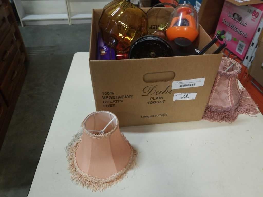 Box of vintage collectible, amber glass, lamp and more
