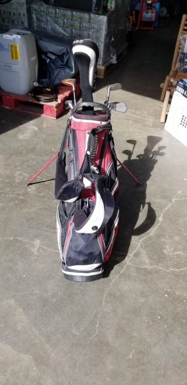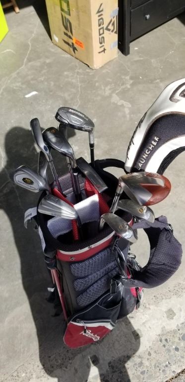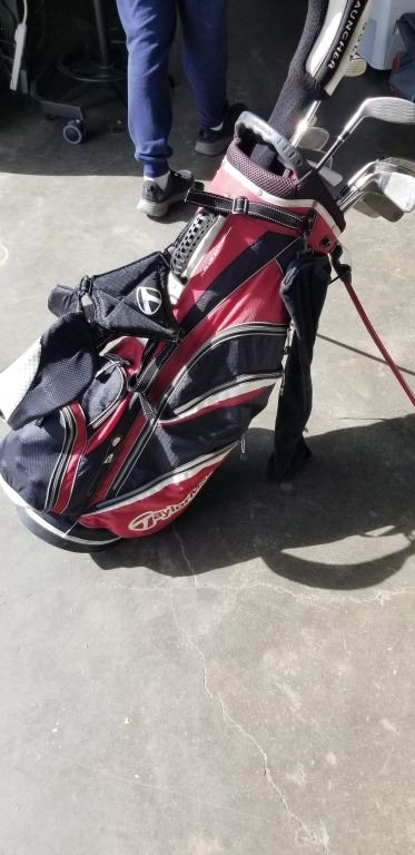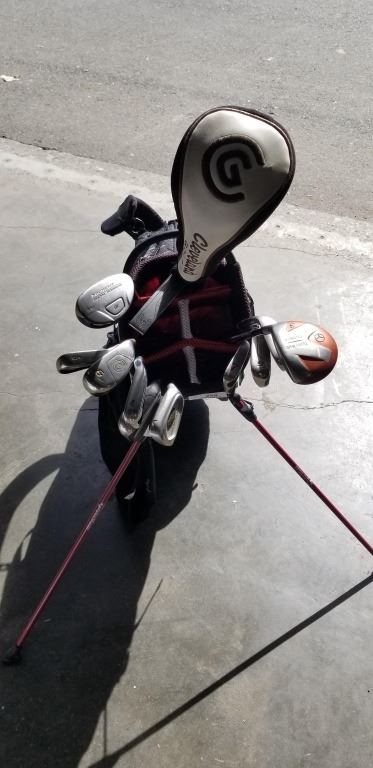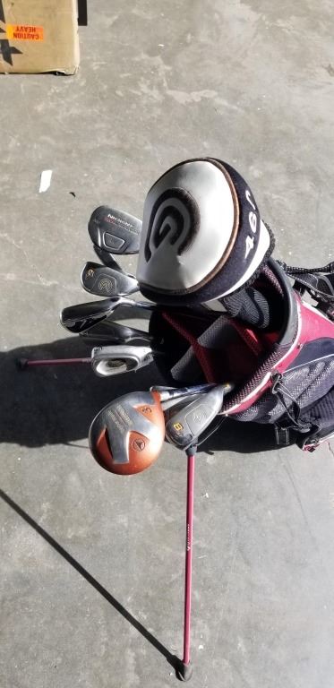 CALLAWAY AND CLEVELAND IRONS INCLUDING HYBRIDS, AND CLEVELAND PUTTER, IN TAYLORMADE BAG WITH DRIVERS