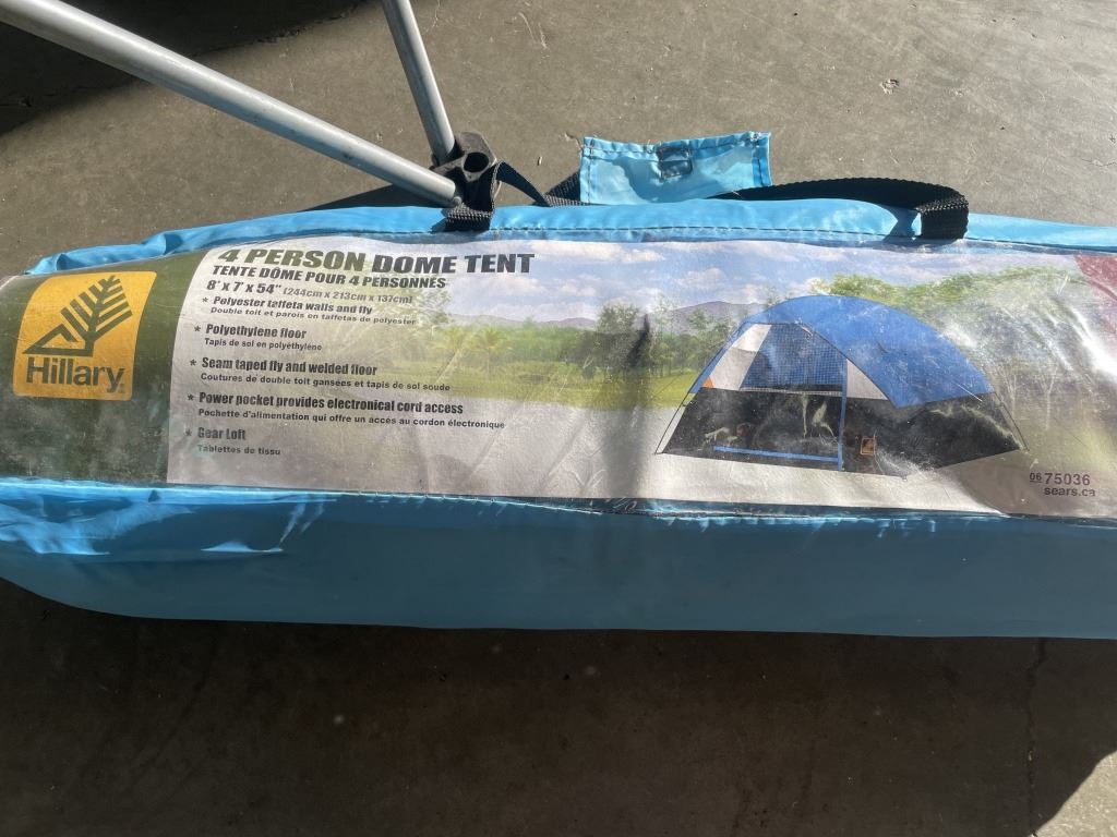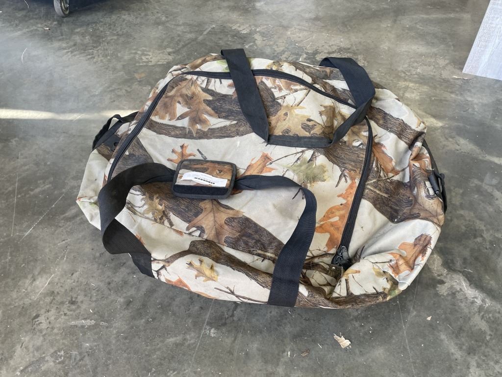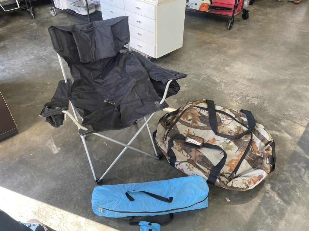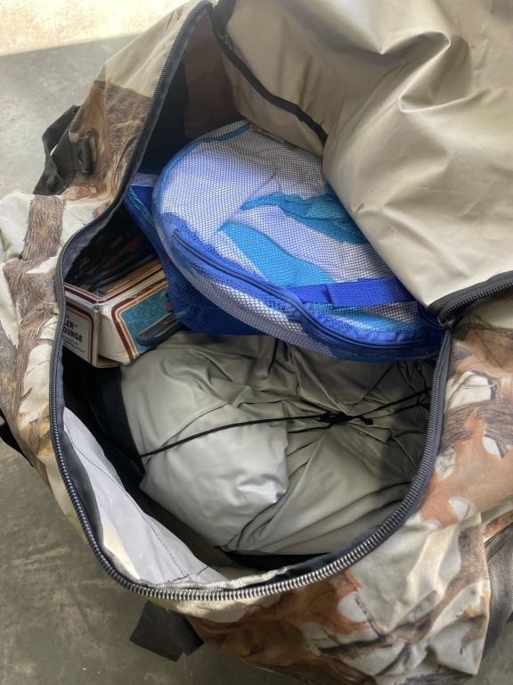 CAMO BAG FULL OF CAMPING INFLATABLES, HAMMOCKS, TENT AND CHAIR
