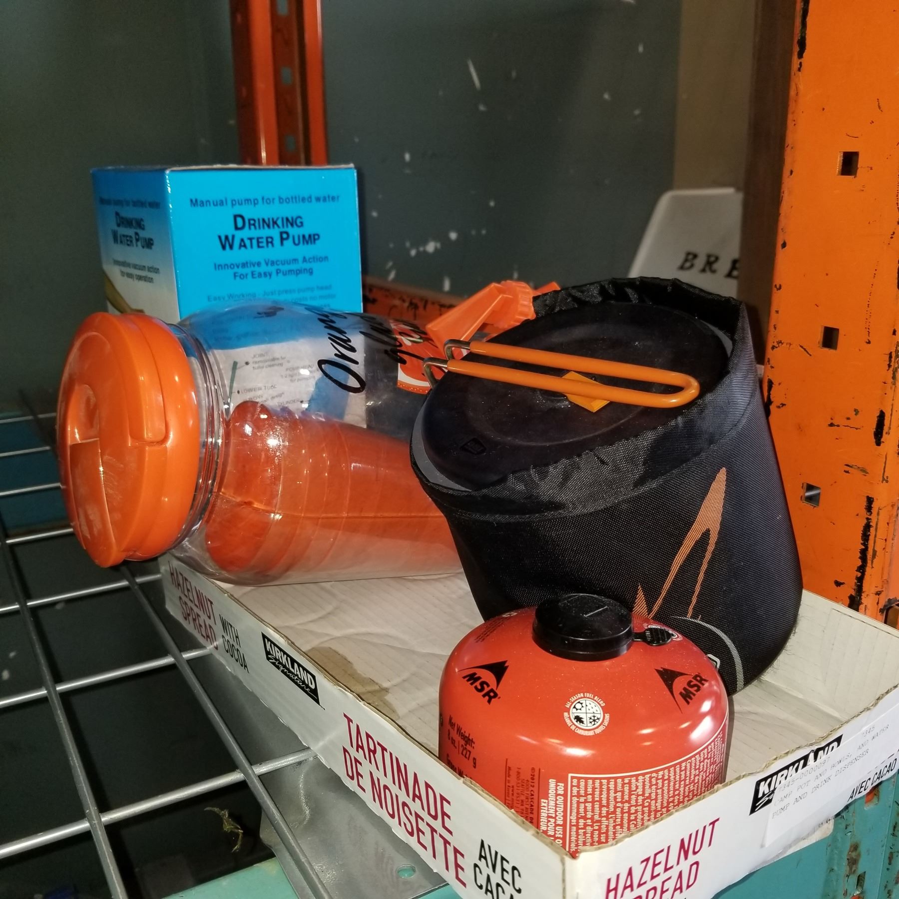 CAMP POT AND BOWLS, AND WATER PUMP AND DRINK DISPENSER