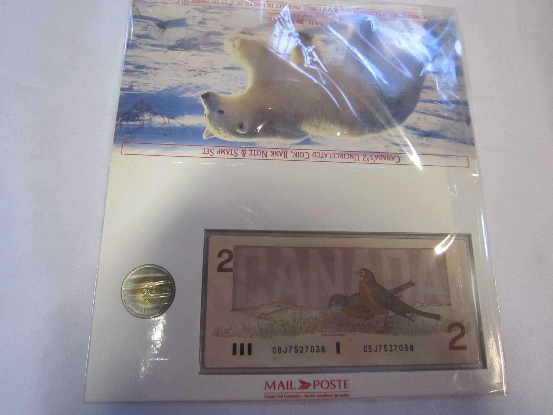 CANADIAN $2 UNCIRCULATED COIN, BANK NOTES, STAMP SET IN CANADA POST FOLDER