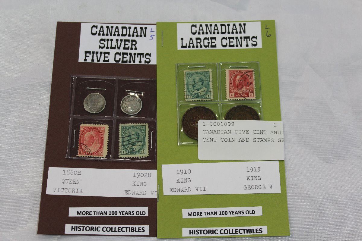CANADIAN FIVE CENT AND LARGE CENT COIN AND STAMPS SET