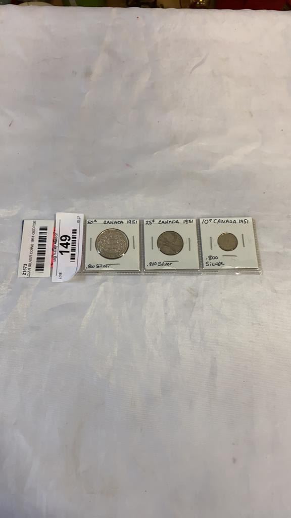 CANADIAN SILVER COINS 1951 GEORGE VI 50 CENT, 25 CENT, 10 CENT - .800 SILVER