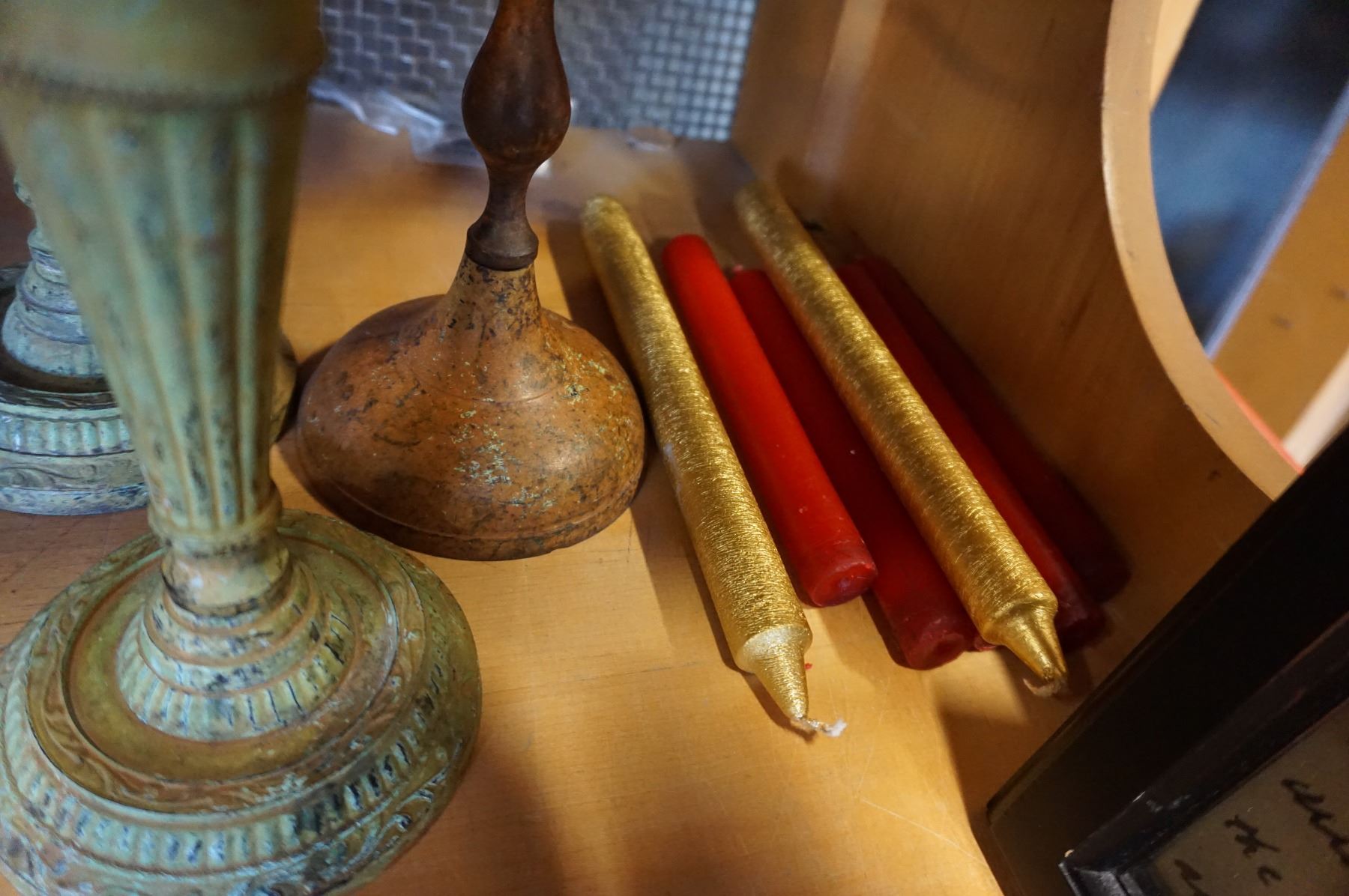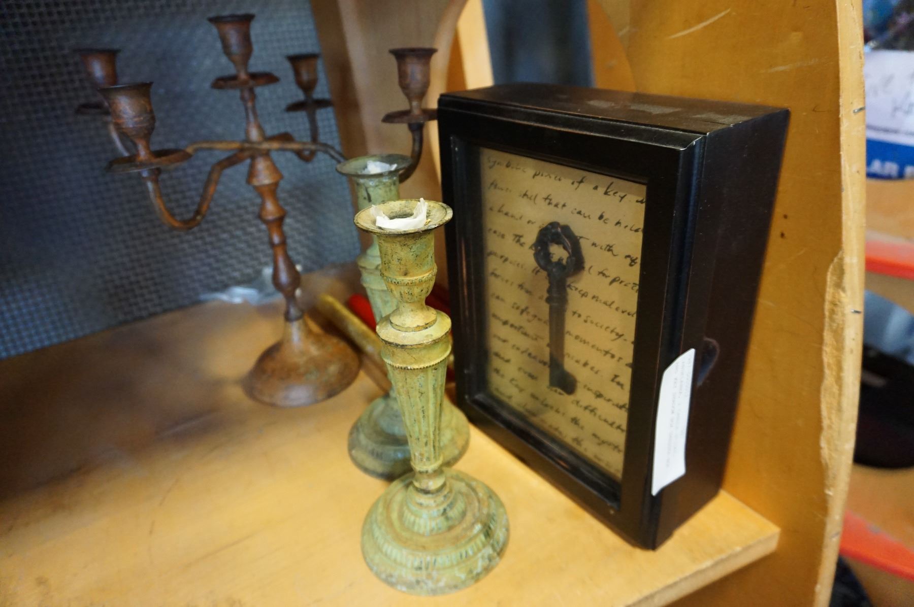 CANDELABRA, 2 CANDLE STICKS, AND KEY SHADOW BOX DRESSER BOX