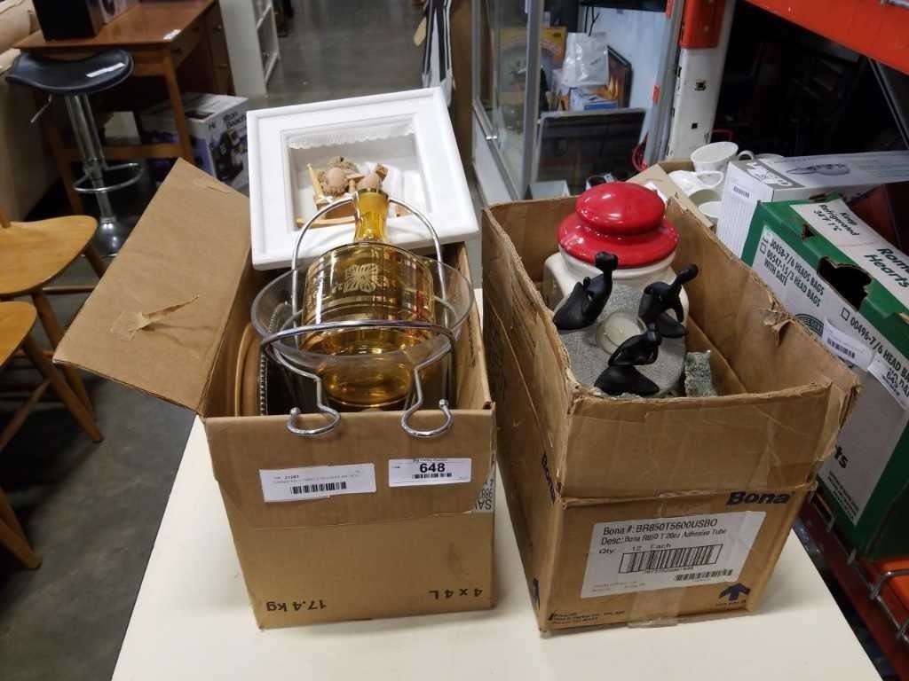 CANNISTER, 2 CANDLE HOLDERS AND BOX OF GLASSWARE