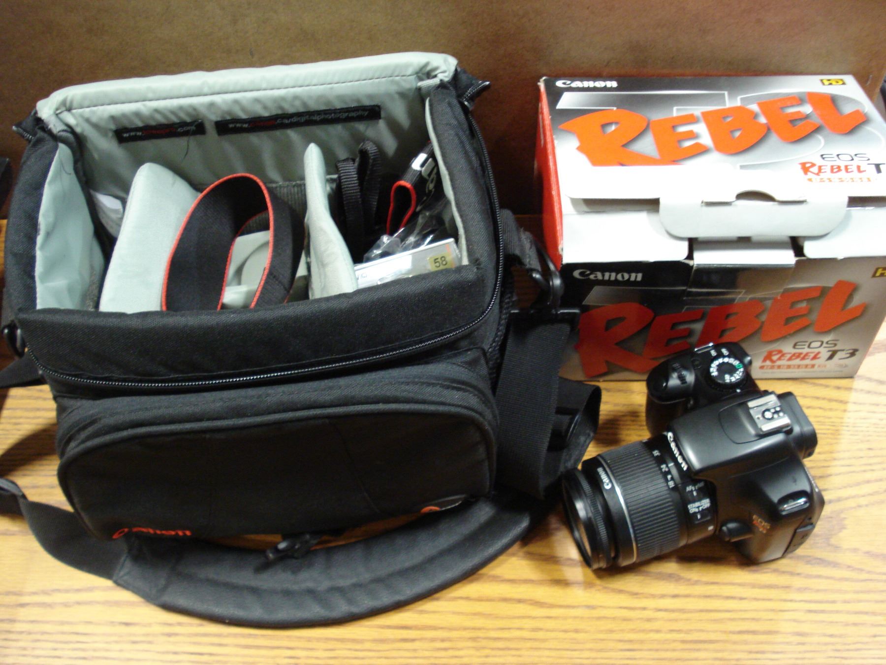 CANON REBEL T3 WITH BOX AND CARRY CASE AS FOUND MAY BE FOR PARTS
