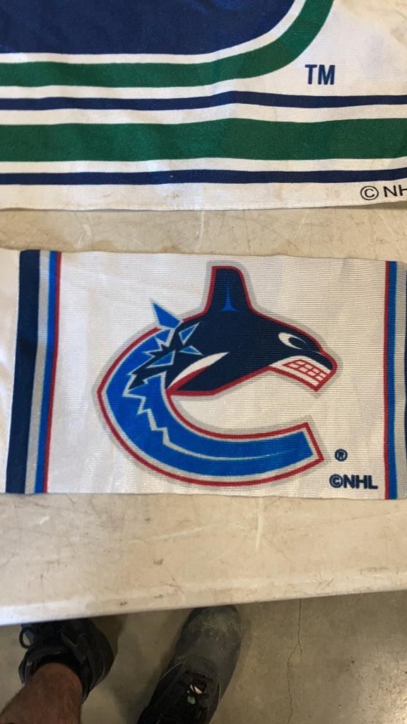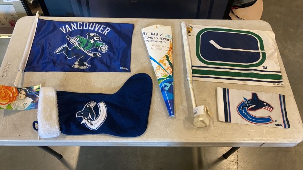 CANUCKS FLAGS, STOCKING AND 2010 OLYMPICS COLLECTIBLE