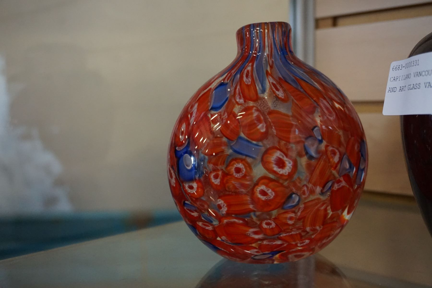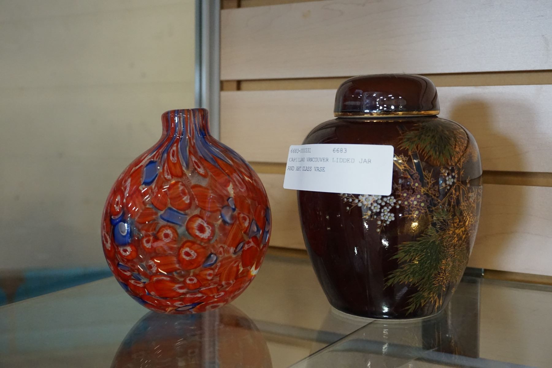 CAPILANO VANCOUVER LIDDED JAR AND ART GLASS VASE