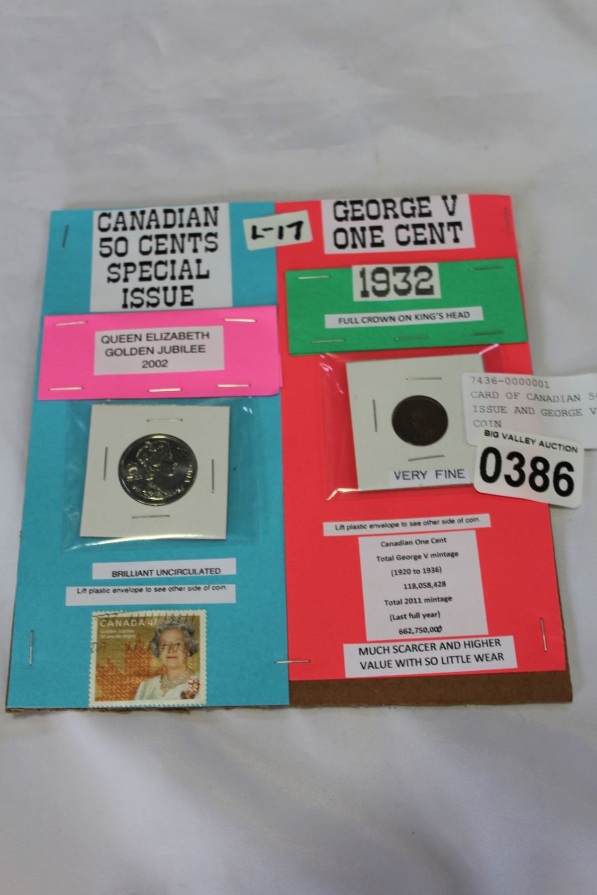 CARD OF CANADIAN 50 SPECIAL ISSUE AND GEORGE V ONE CENT COIN