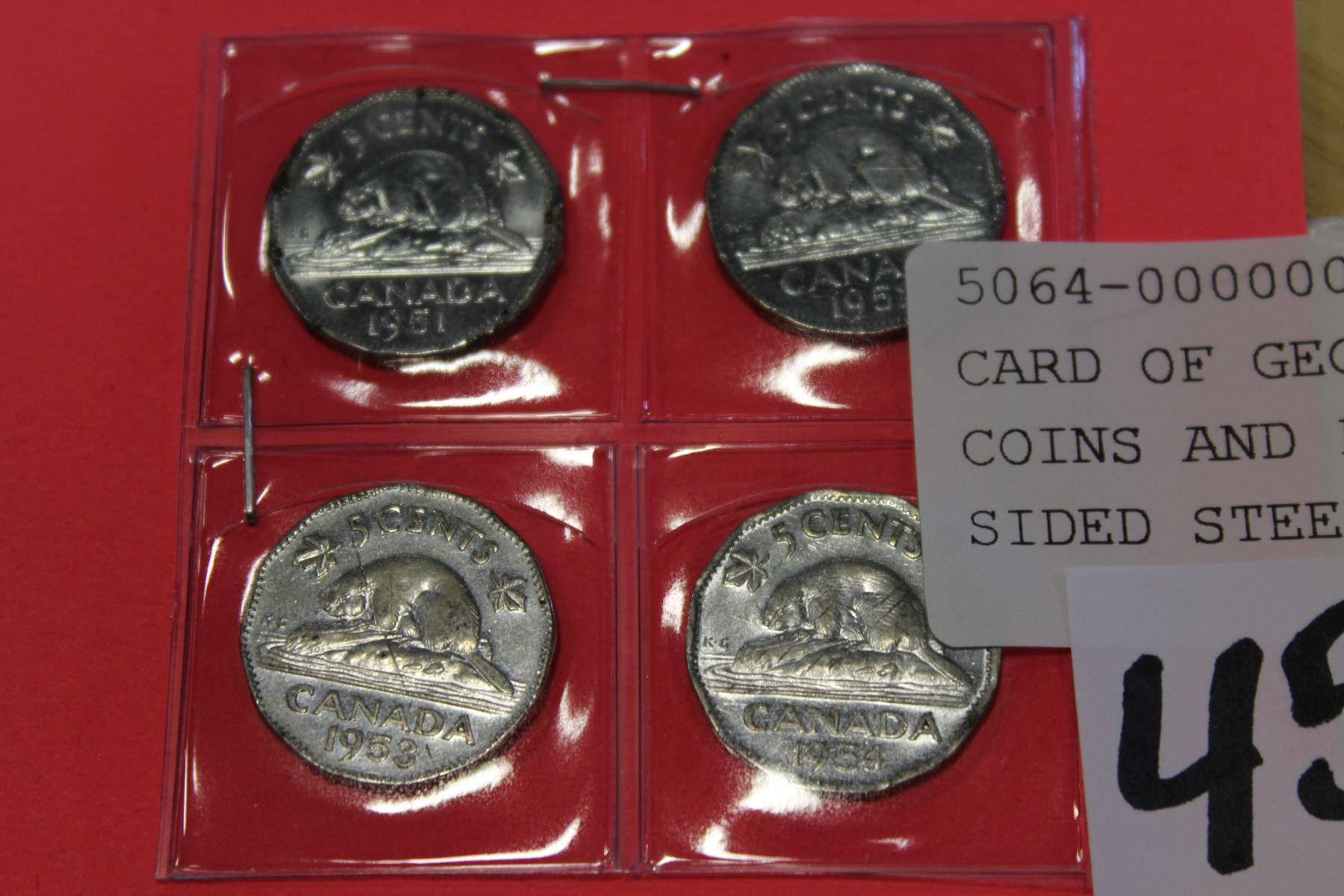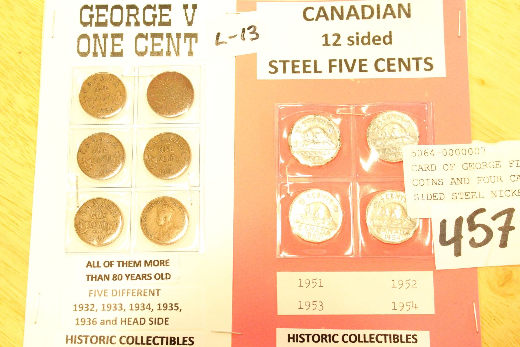 CARD OF GEORGE FIVE ONE CENT COINS AND FOUR CANADIAN TWELVE SIDED STEEL NICKELS