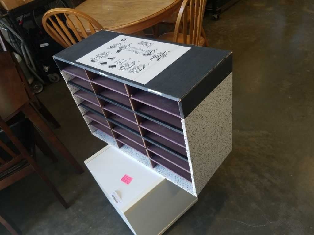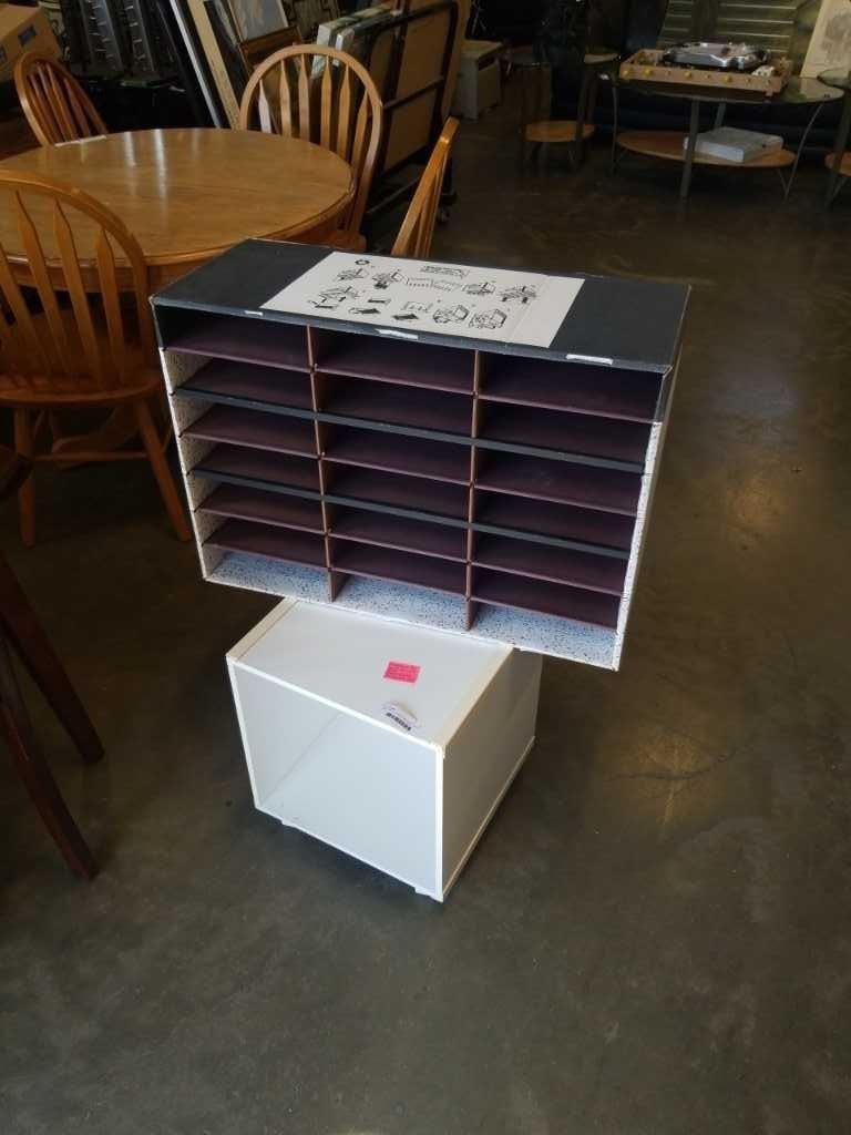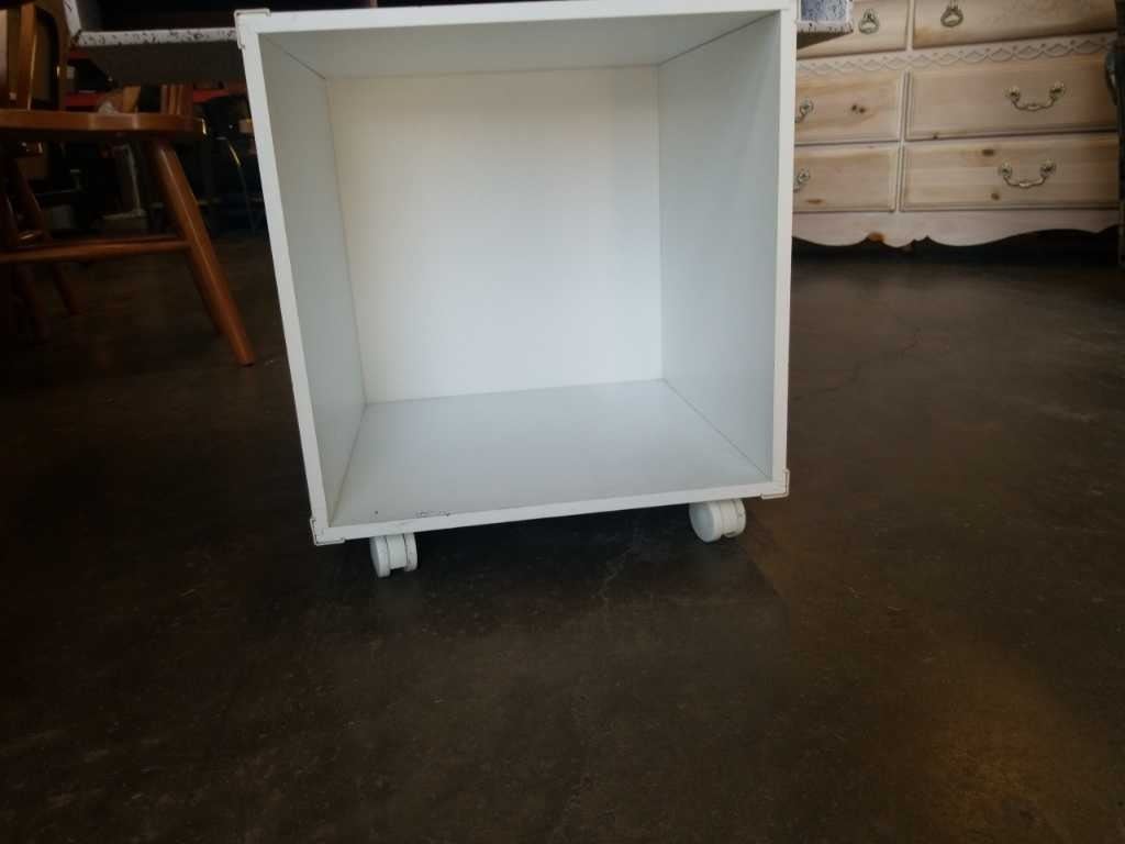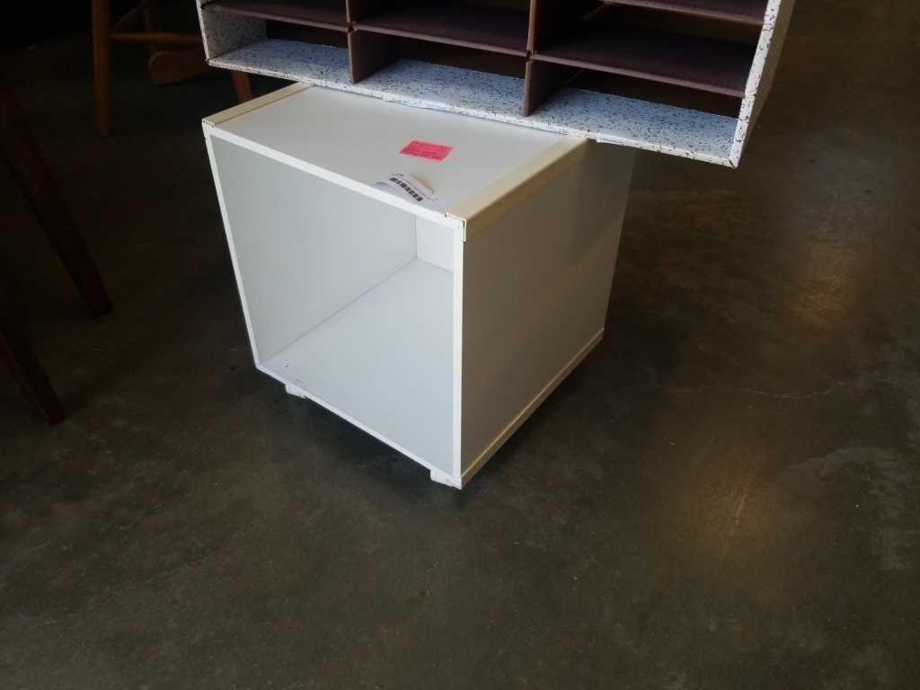 CARDBOARD FILE SHELF AND CUBIC WHITE ROLLING SIDE TABLE