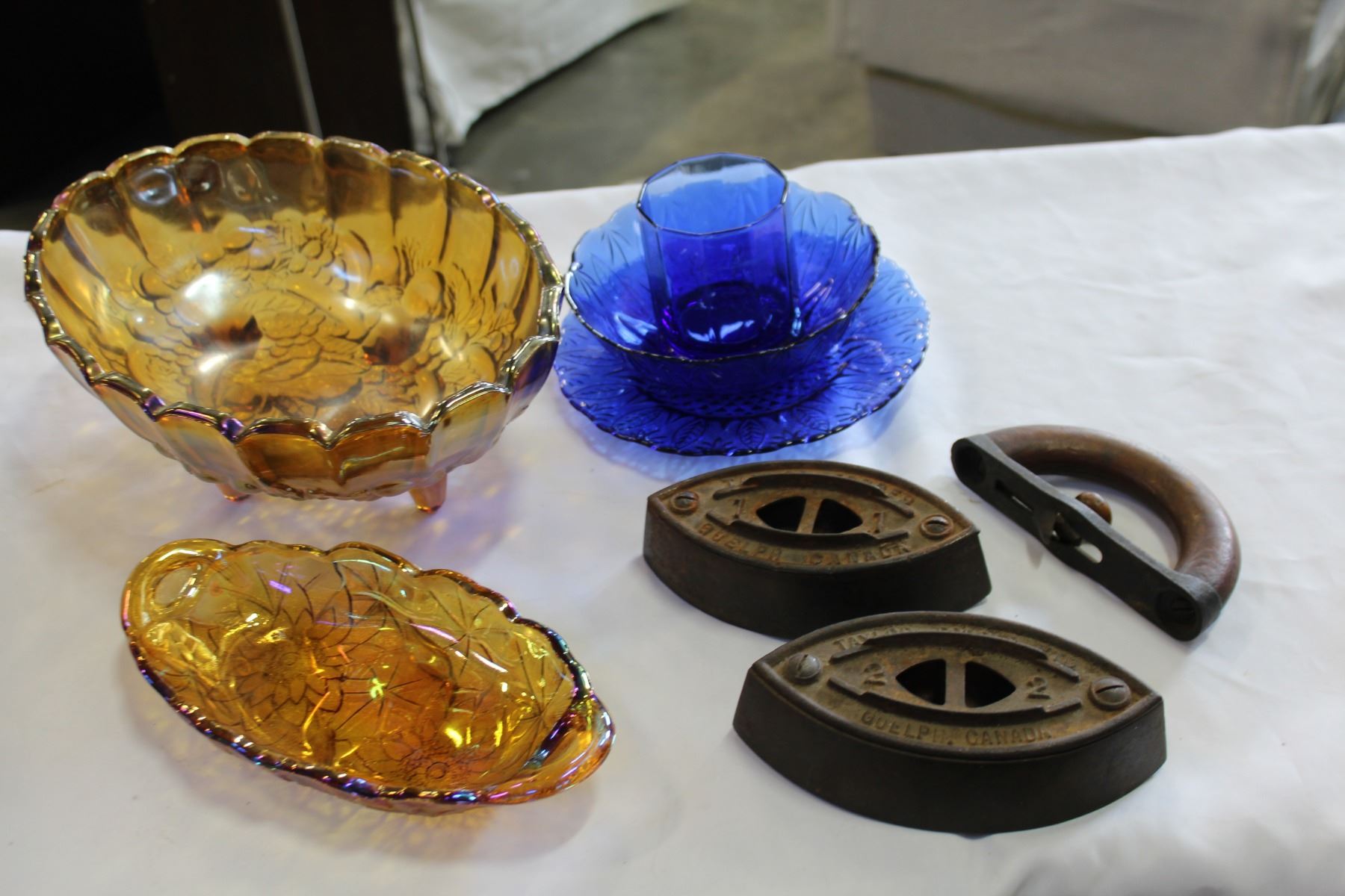 CARNIVAL GLASS BLUE GLASS AND IRONS