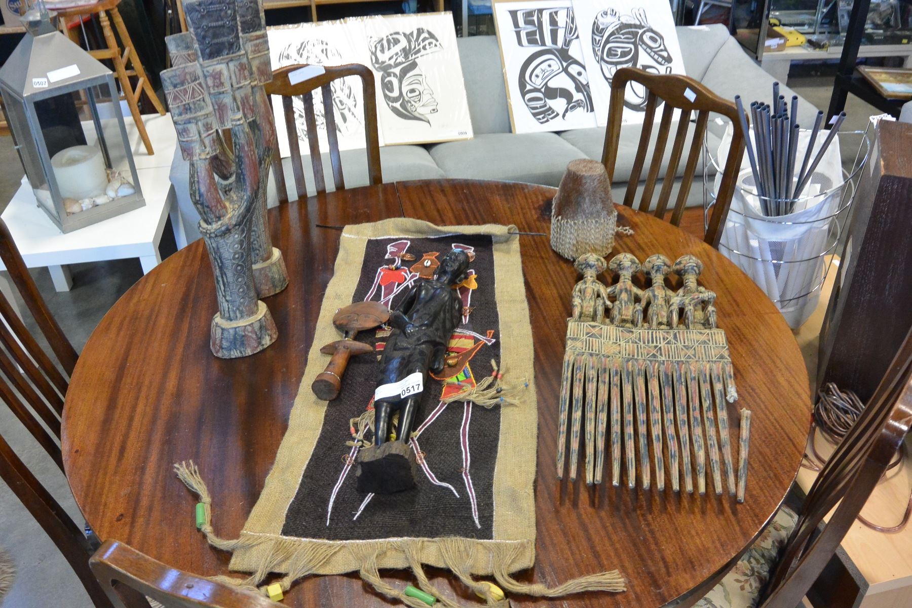CARVED AFRICAN FIGURES SMALL DRUM AND UGANDA TAPESTRY
