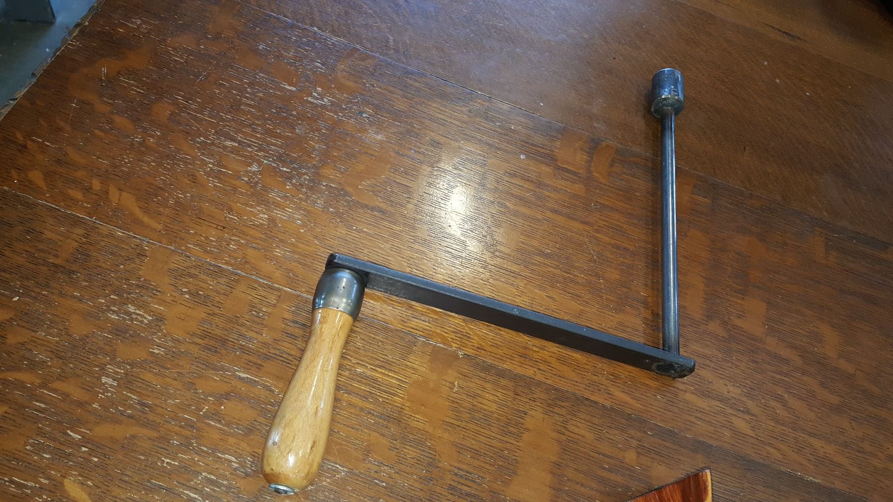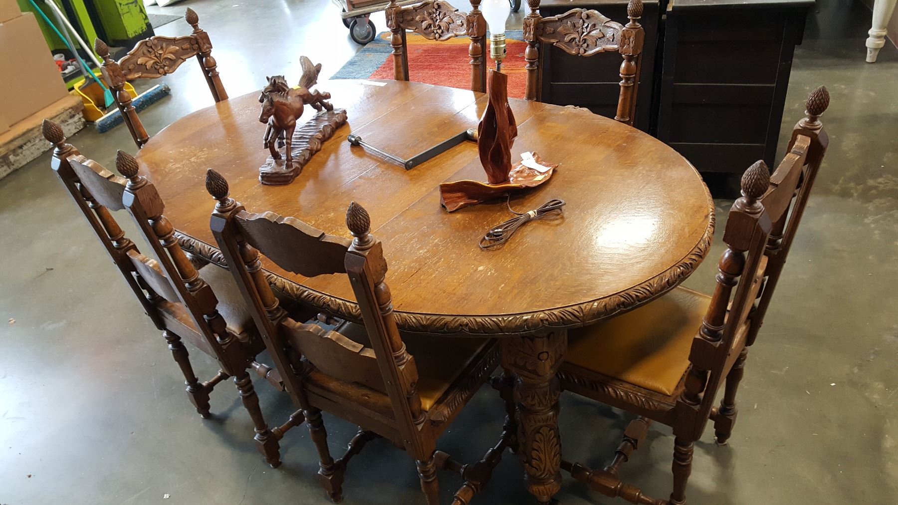 CARVED ANTIQUE CRANK DINGING TABLE W/ CRANK AND 2 LEAFS W/ 6 CHAIRS