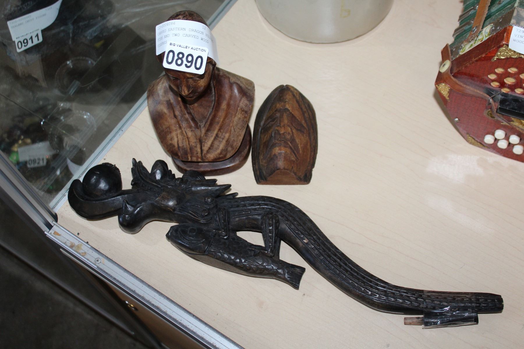 CARVED EASTERN DRAGON HOLDING FISH AND TWO CARVED WOOD FIGURES