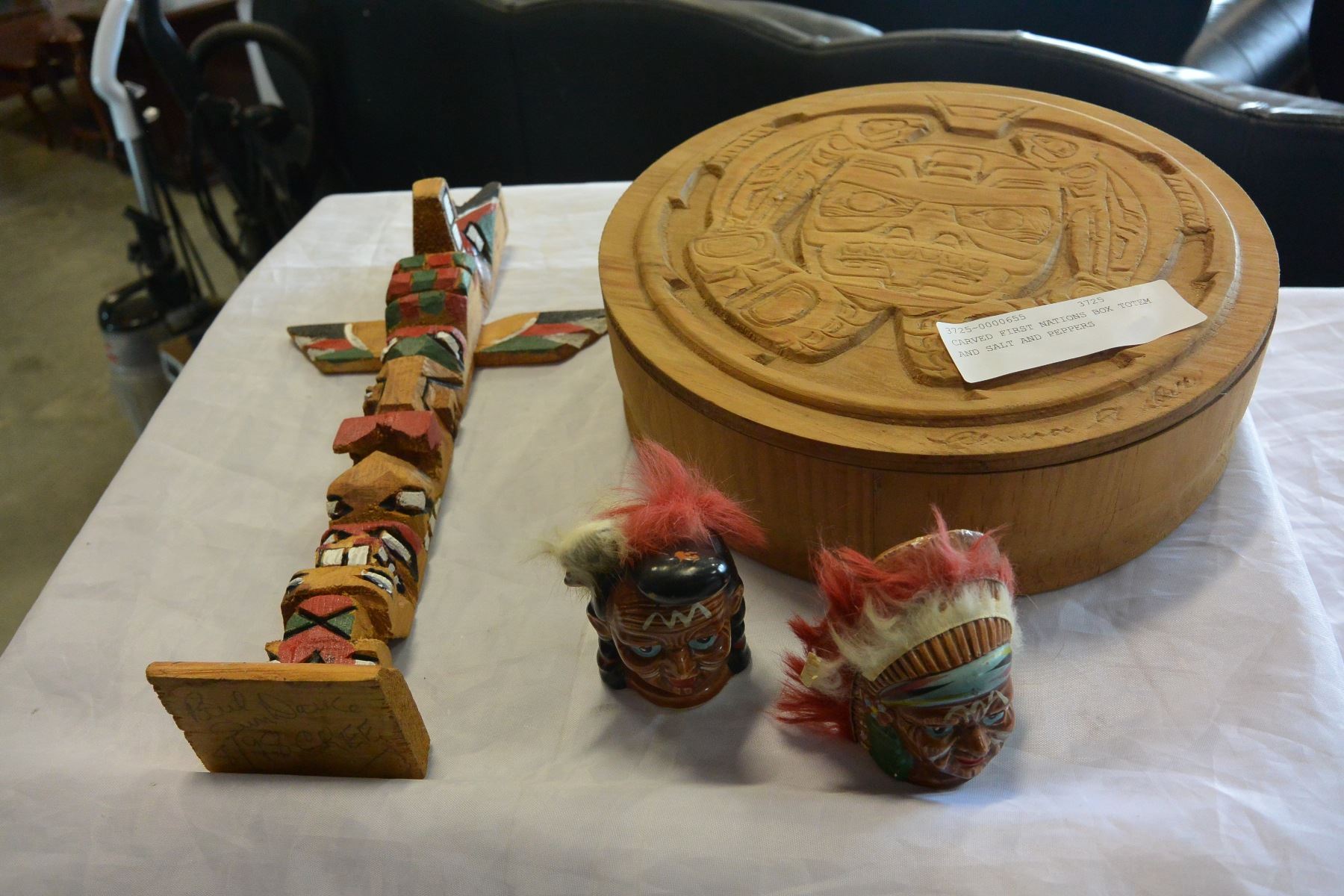 CARVED FIRST NATIONS BOX TOTEM AND SALT AND PEPPERS