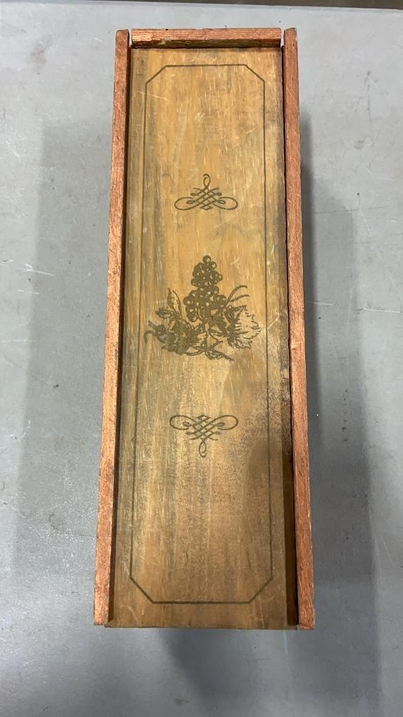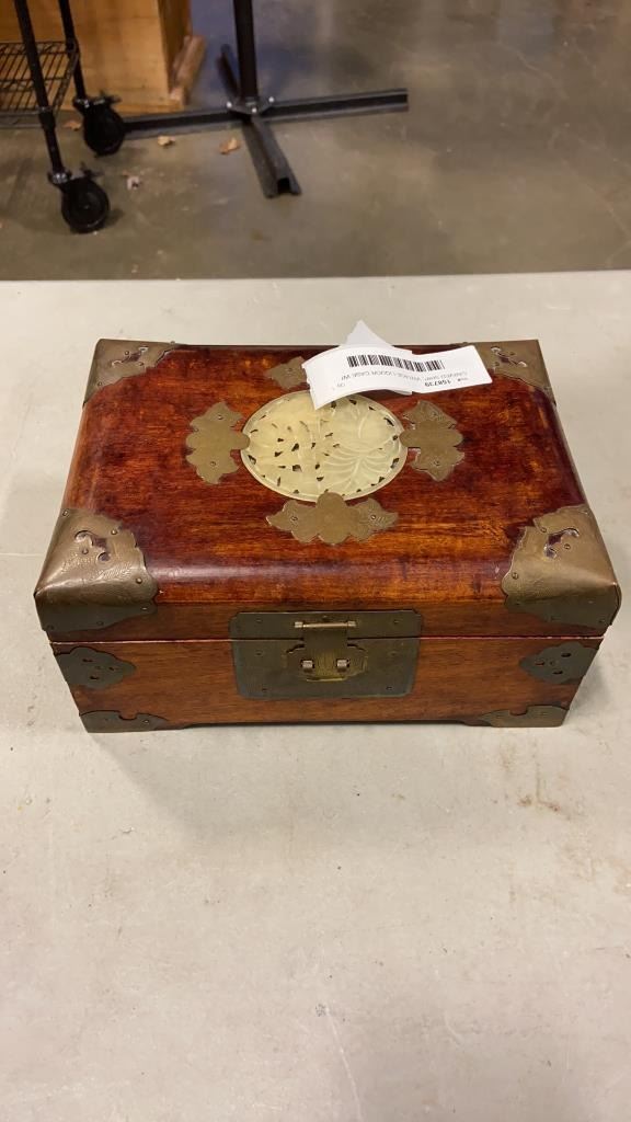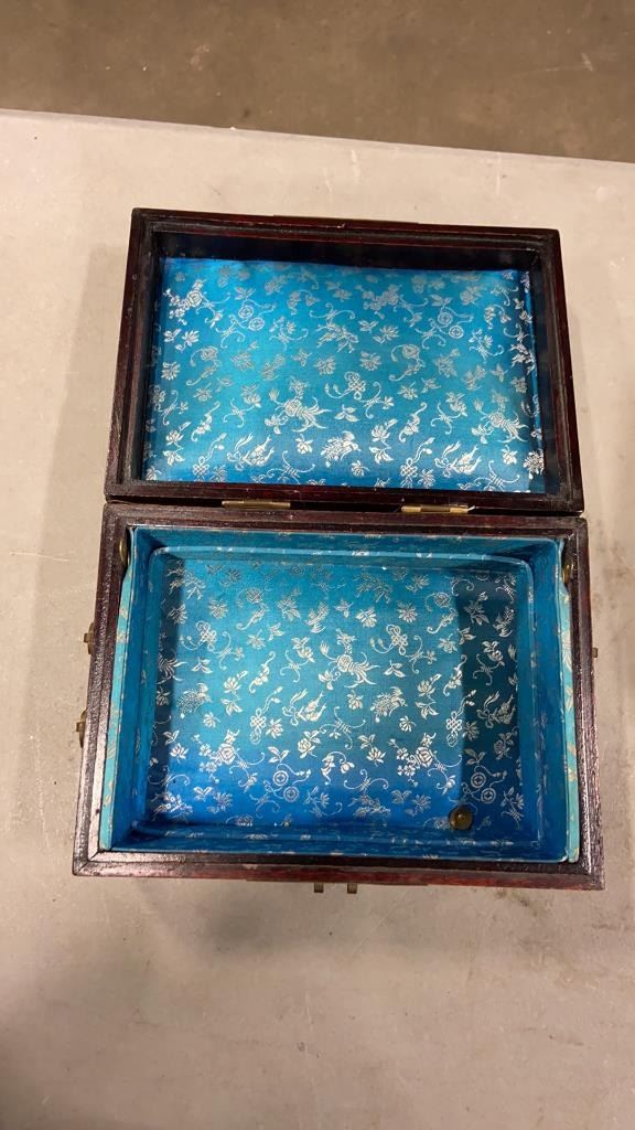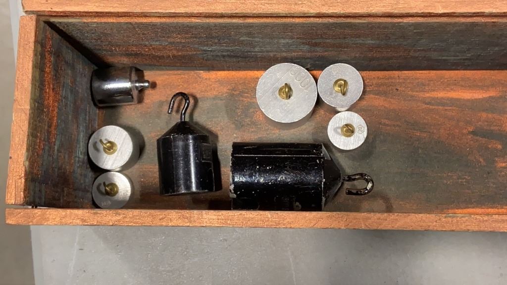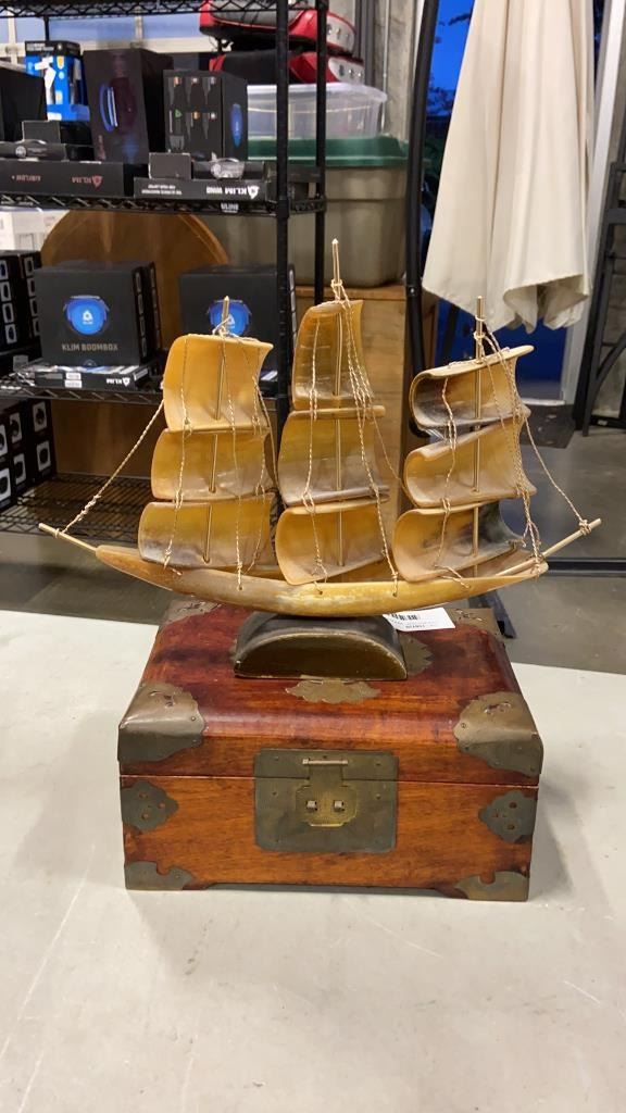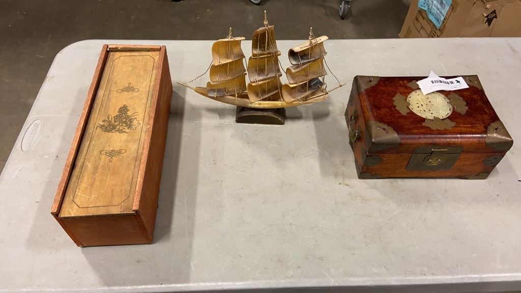 CARVED SHIP, VINTAGE LIQUOR CASE W/ WEIGHTS, AND BRASS BOUND JEWELLERY BOX