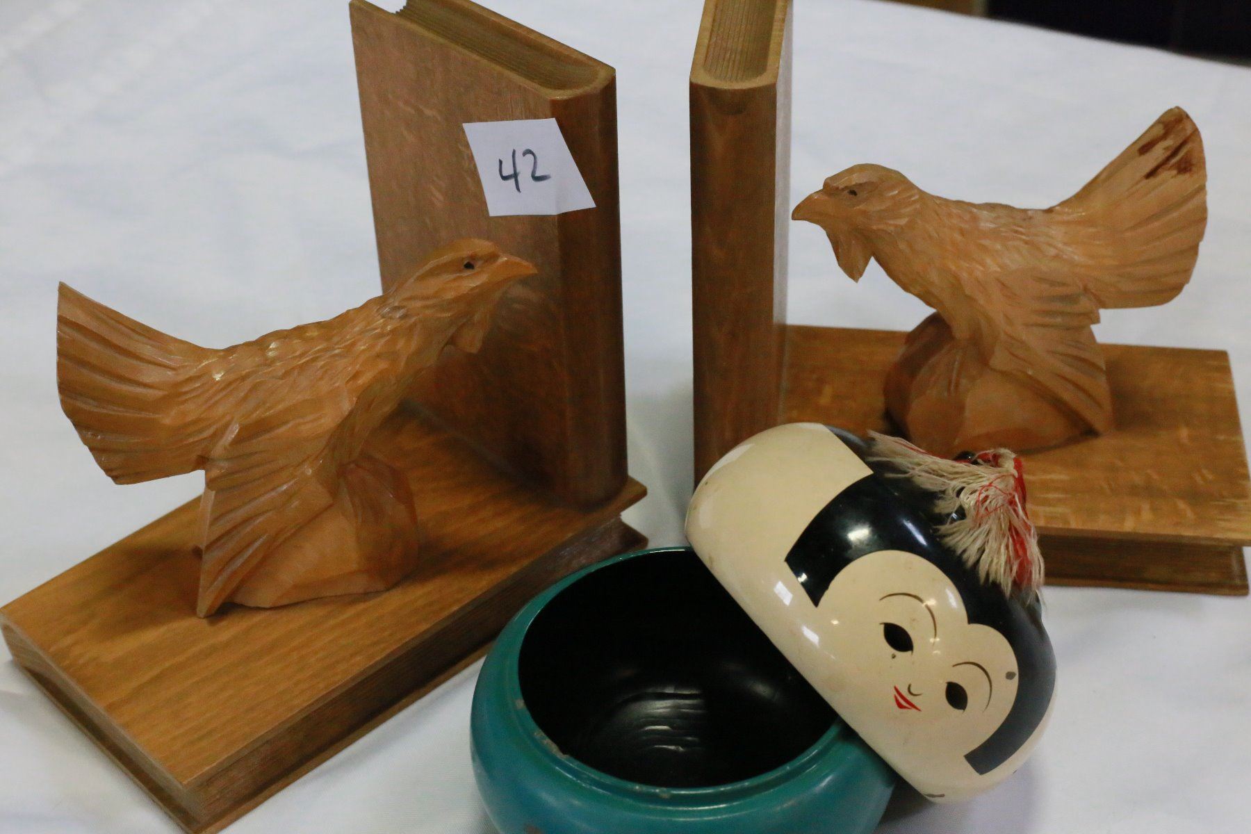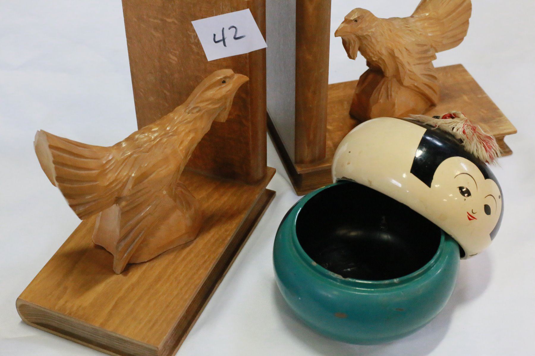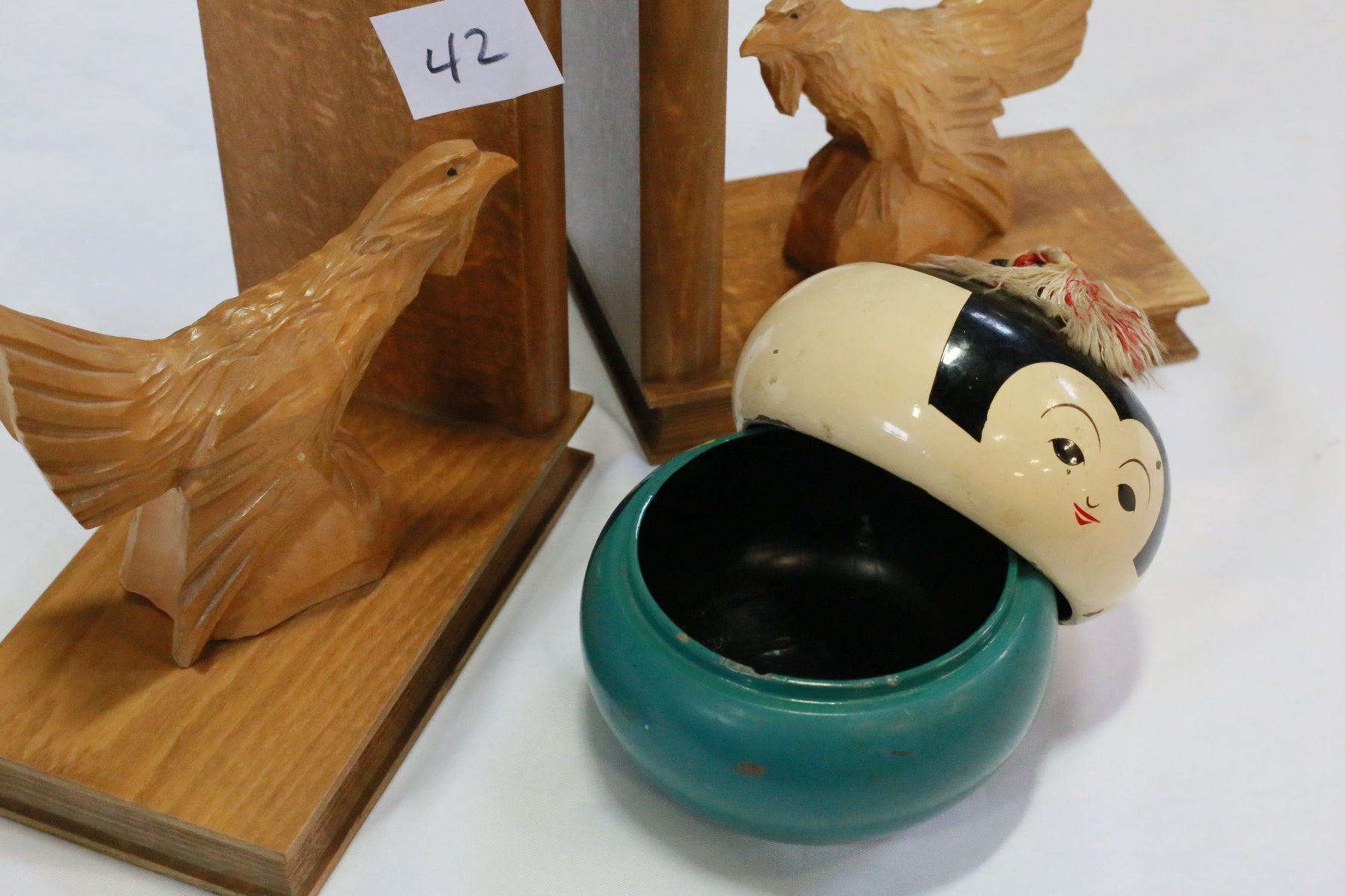 CARVED WOOD EAGLE BOOKENDS AND FIGURAL WOOD DRESSER DISH