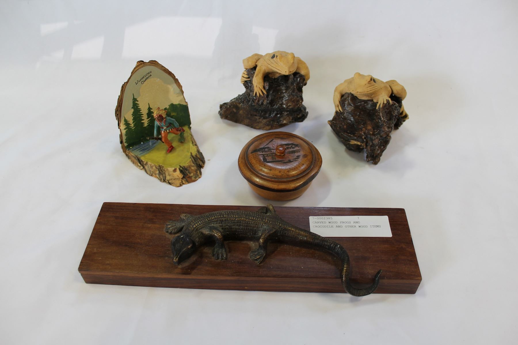 CARVED WOOD FROGS AND CROCODILE AND OTHER WOOD ITEMS