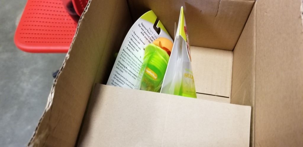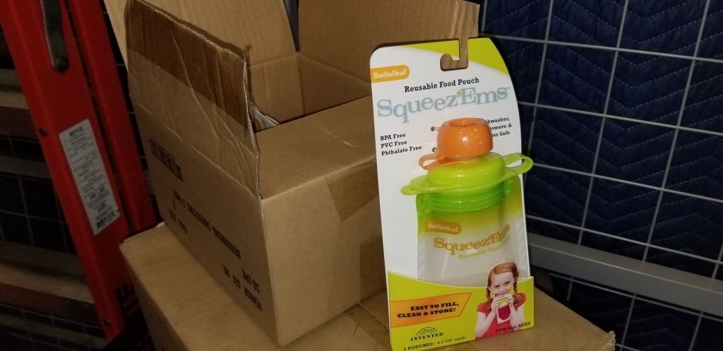 CASE OF 24 NEW SQUEEZ EMS REUSABLE FOOD POUCHES RETAIL $11.99 FOR 2 - RETAIL TOTAL $140 AND SOFT BIBS