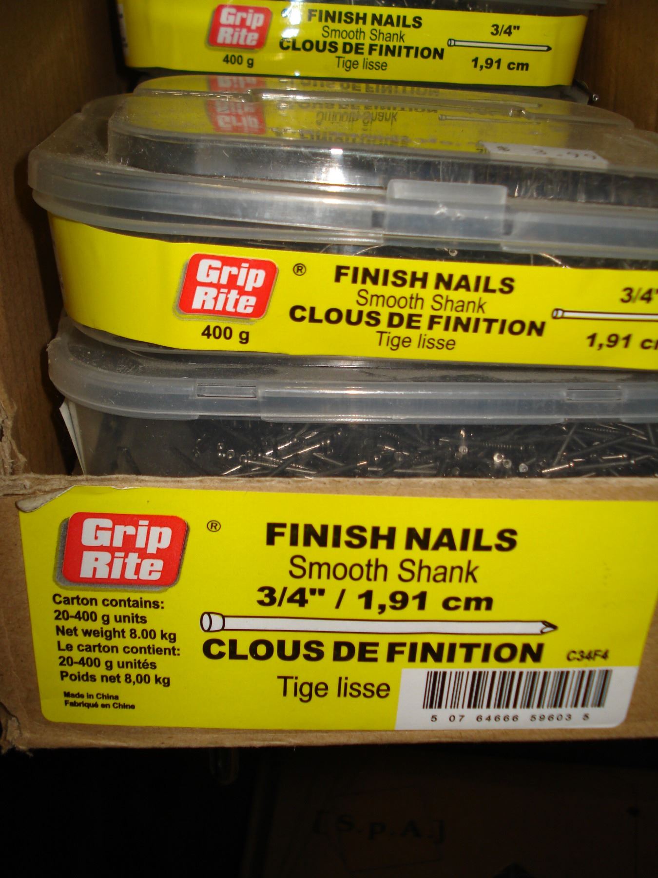CASE OF FINISH NAILS AND BOLTS