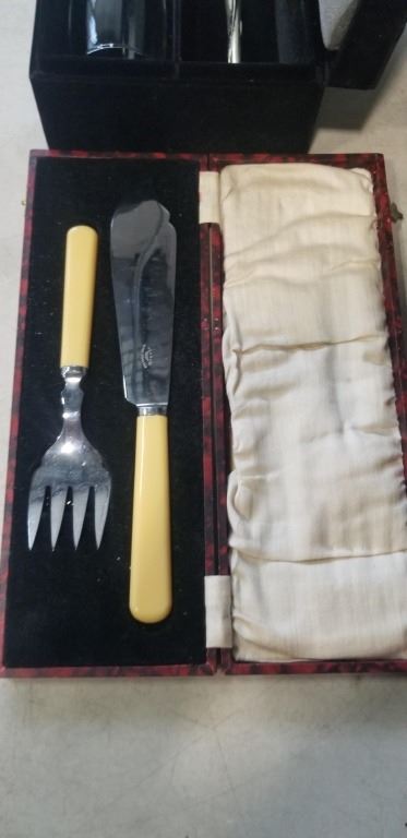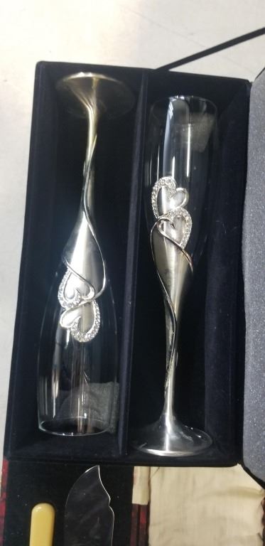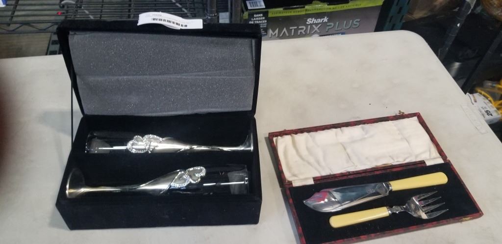 CASED LOVERS CHAMPAGNE FLUTE SET AND STAINLESS CARVING SET