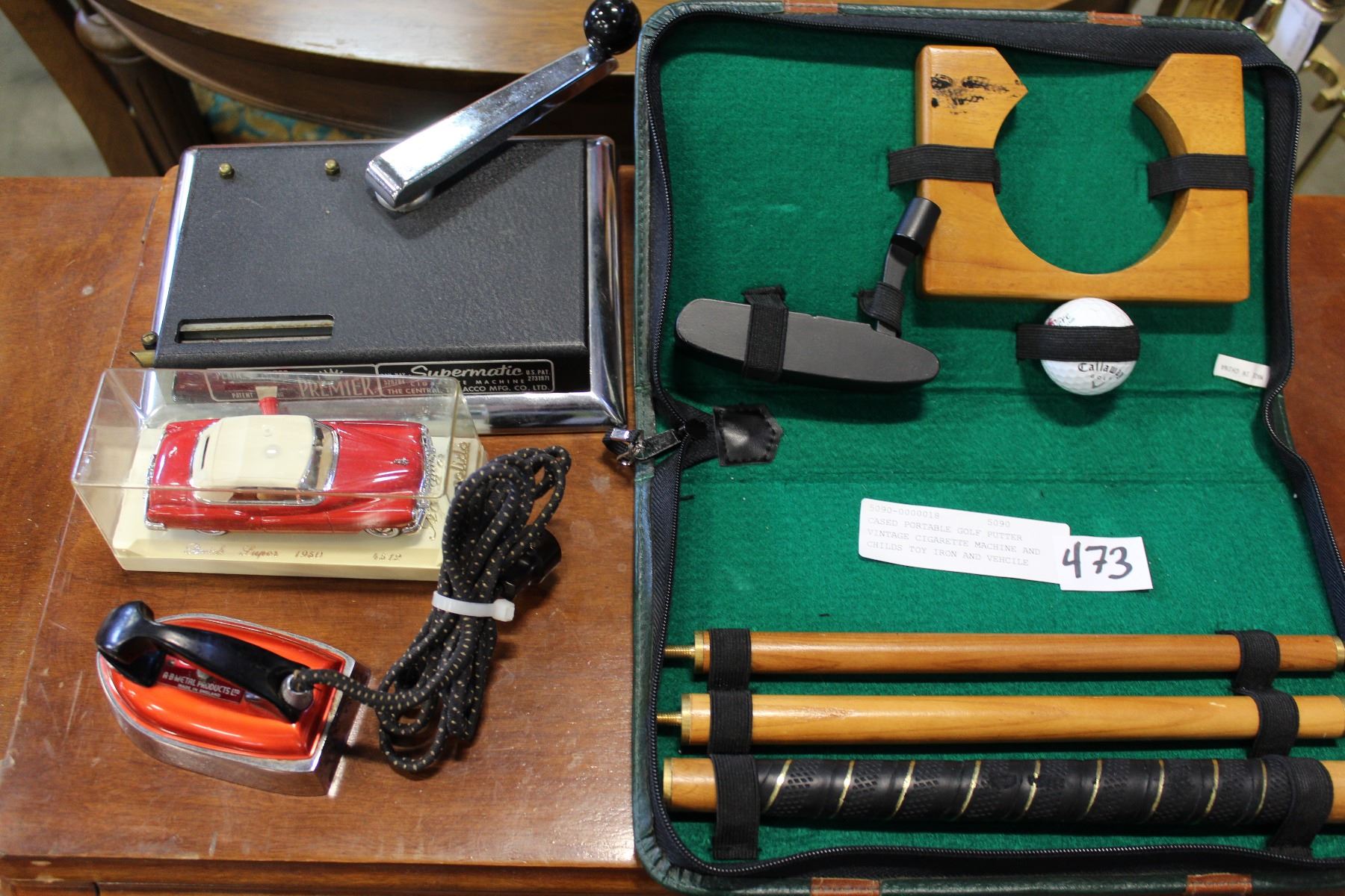 CASED PORTABLE GOLF PUTTER VINTAGE CIGARETTE MACHINE AND CHILDS TOY IRON AND VEHCILE