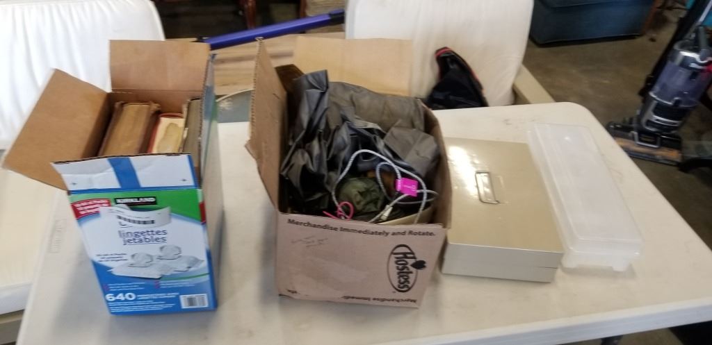 CASH BOX, PICTURE FRAMES,BOX OF BOOKS AND ASSORTED ITEMS