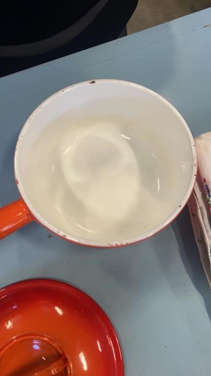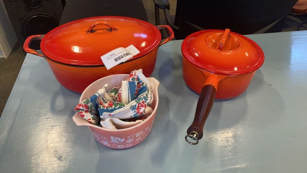 CASRON JAPAN ENAMELED CAST IRON POT WITH LID, PINK PYREX BOW AND LIDDED ENAMELED CAST IRON DUTCH OVE