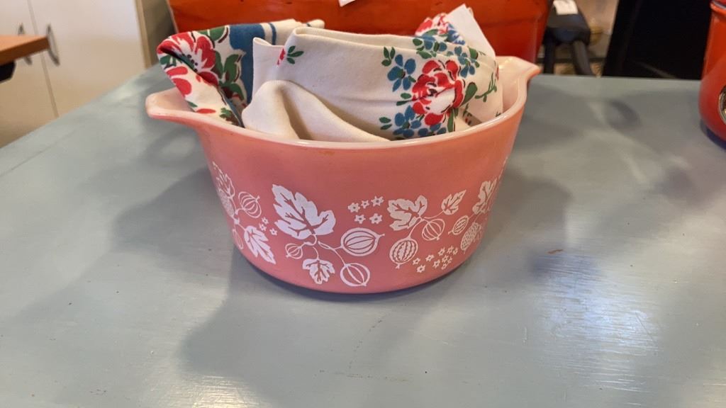 CASRON JAPAN ENAMELED CAST IRON POT WITH LID, PINK PYREX BOW AND LIDDED ENAMELED CAST IRON DUTCH OVEN