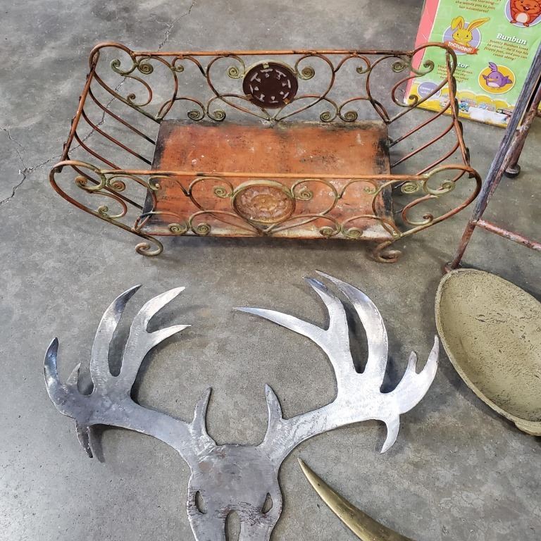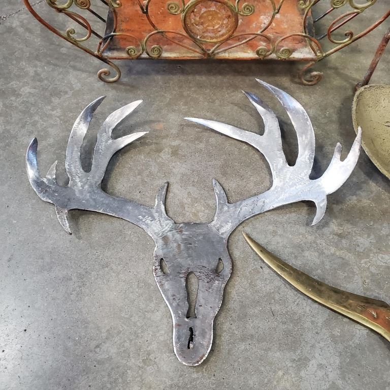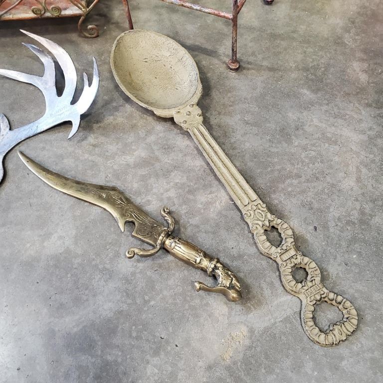 CAST IRON 2 FT SPOON WITH NON FERROUS DECORATIVE KNIFE LASER CUT SKULL/ANTLERS PLANTER AND STAND