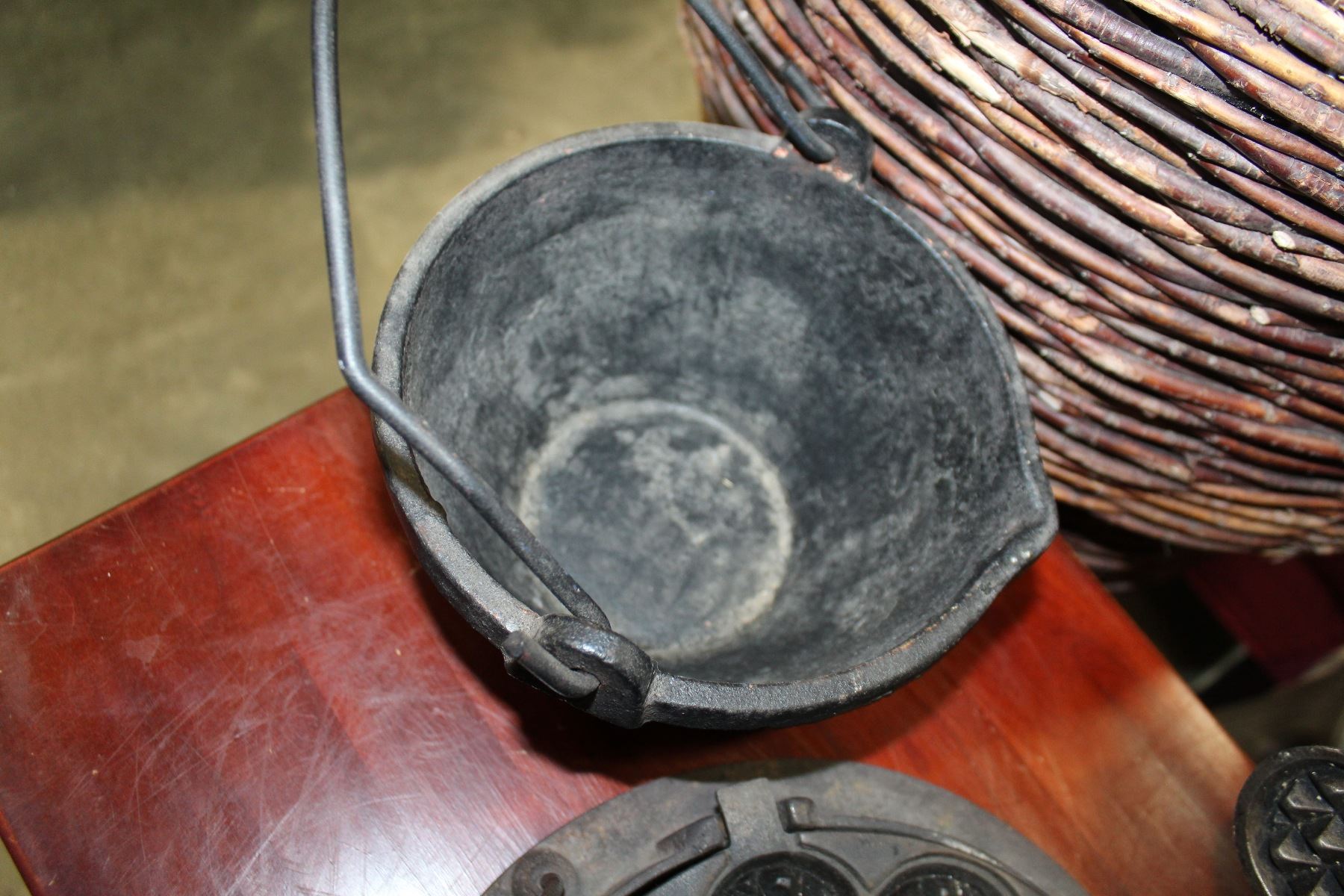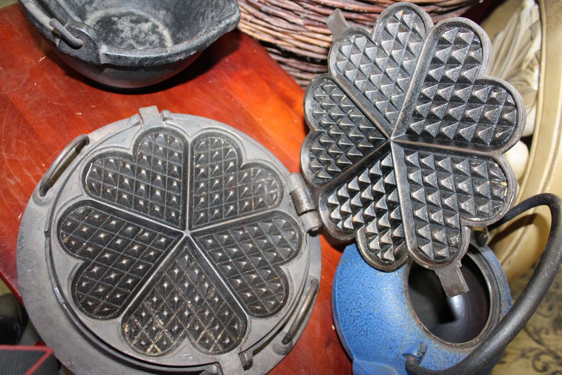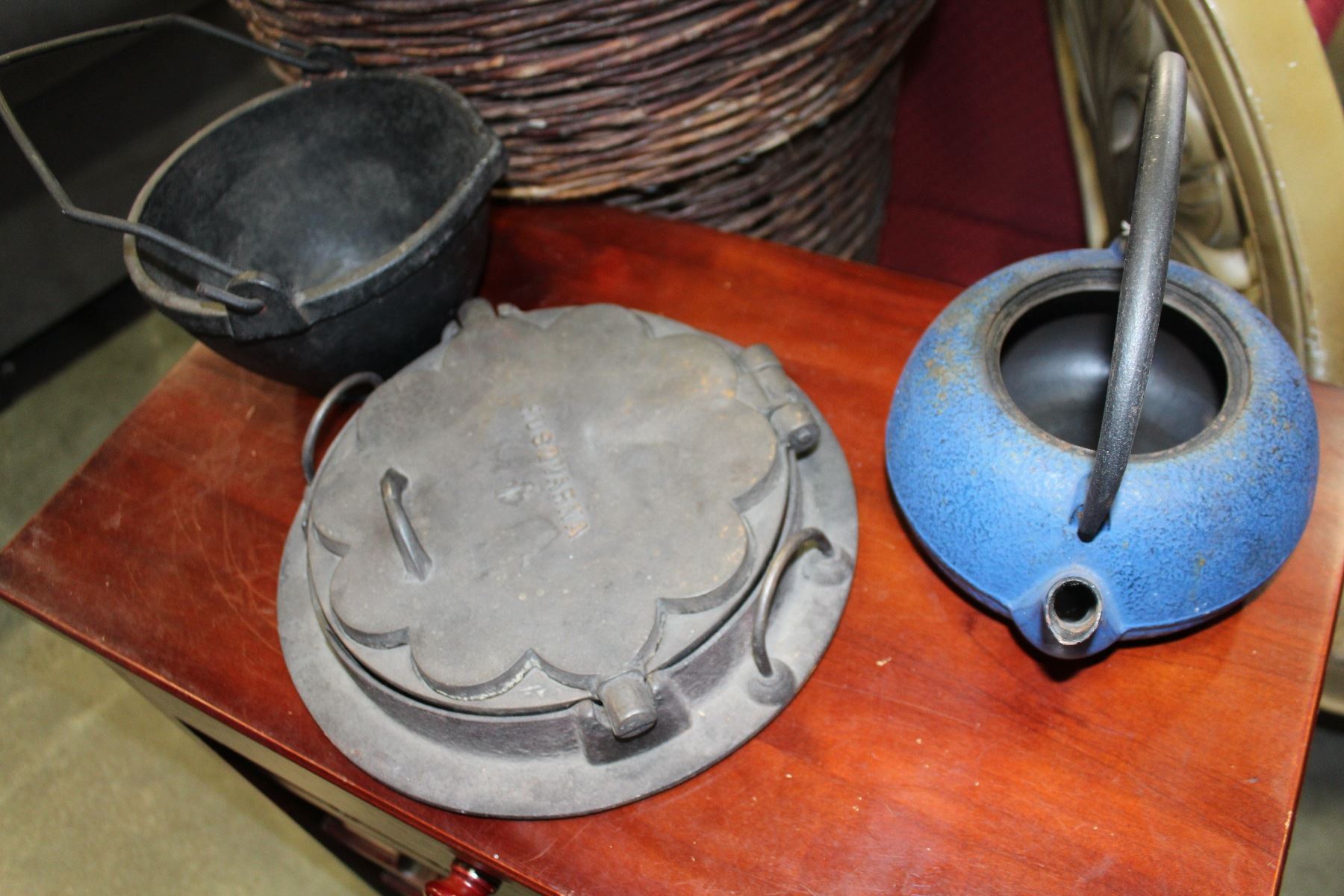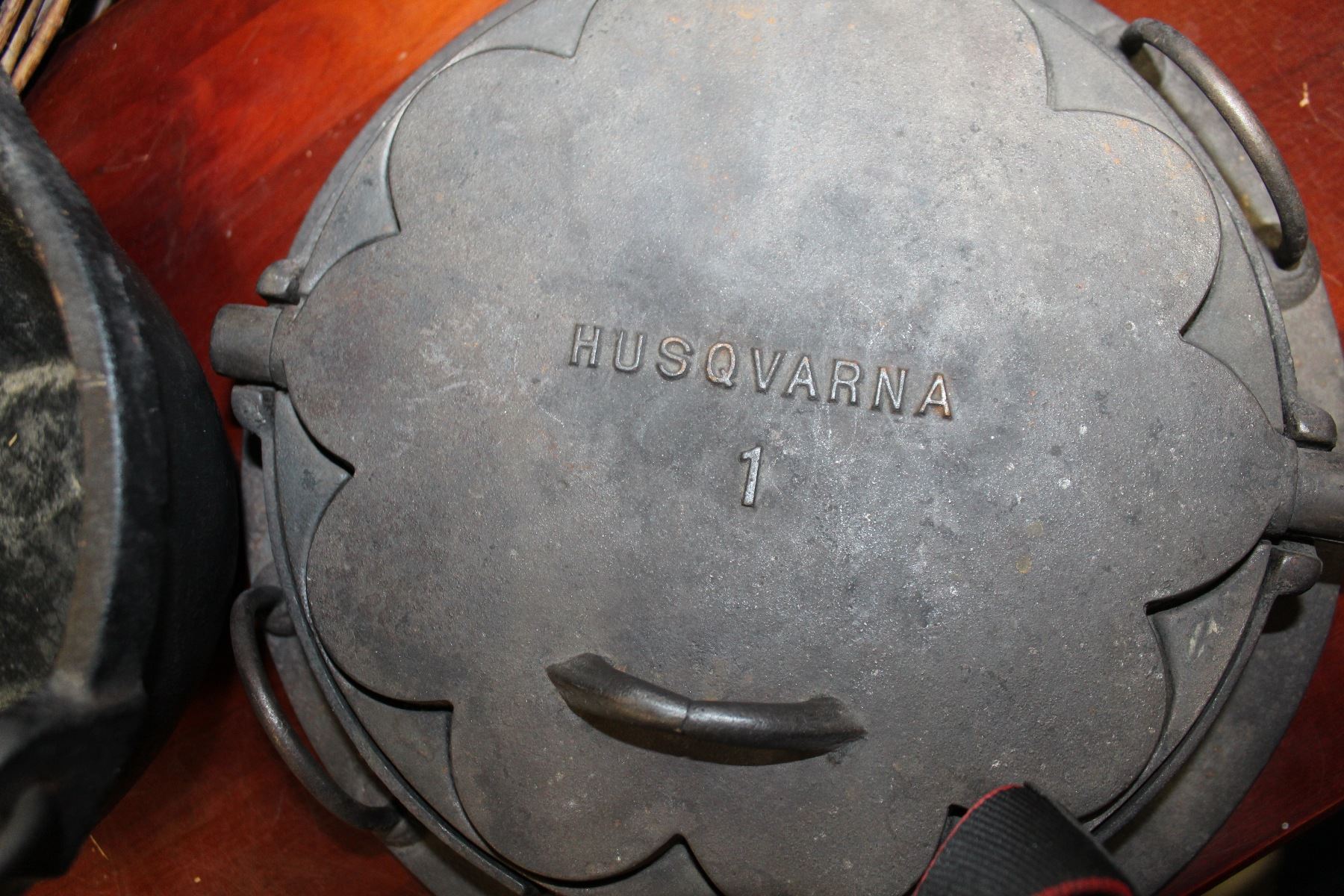 CAST IRON BUCKET, HUSQVARNA NO 1 WAFFLE IRON AND TEA POT