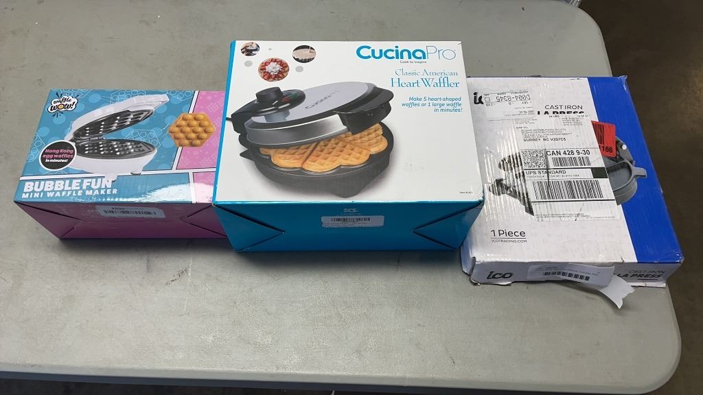 CAST IRON TORTILLA PRESS, CUCINA PRO HEART WAFFLE MAKER AND BUBBLE WAFFLE MAKER