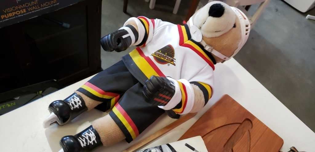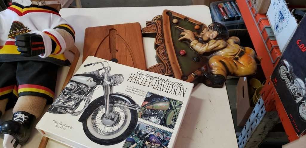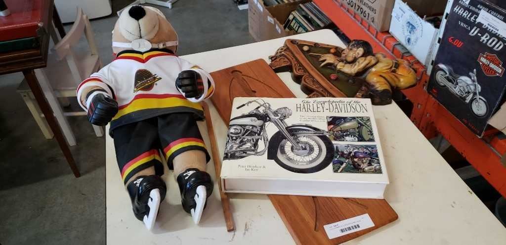 CHALKWARE BILLIARDS FIGURE, TEAK BOARD, HARLEY DAVIDSON HARDCOVER BOOK AND CANUCKS BEAR