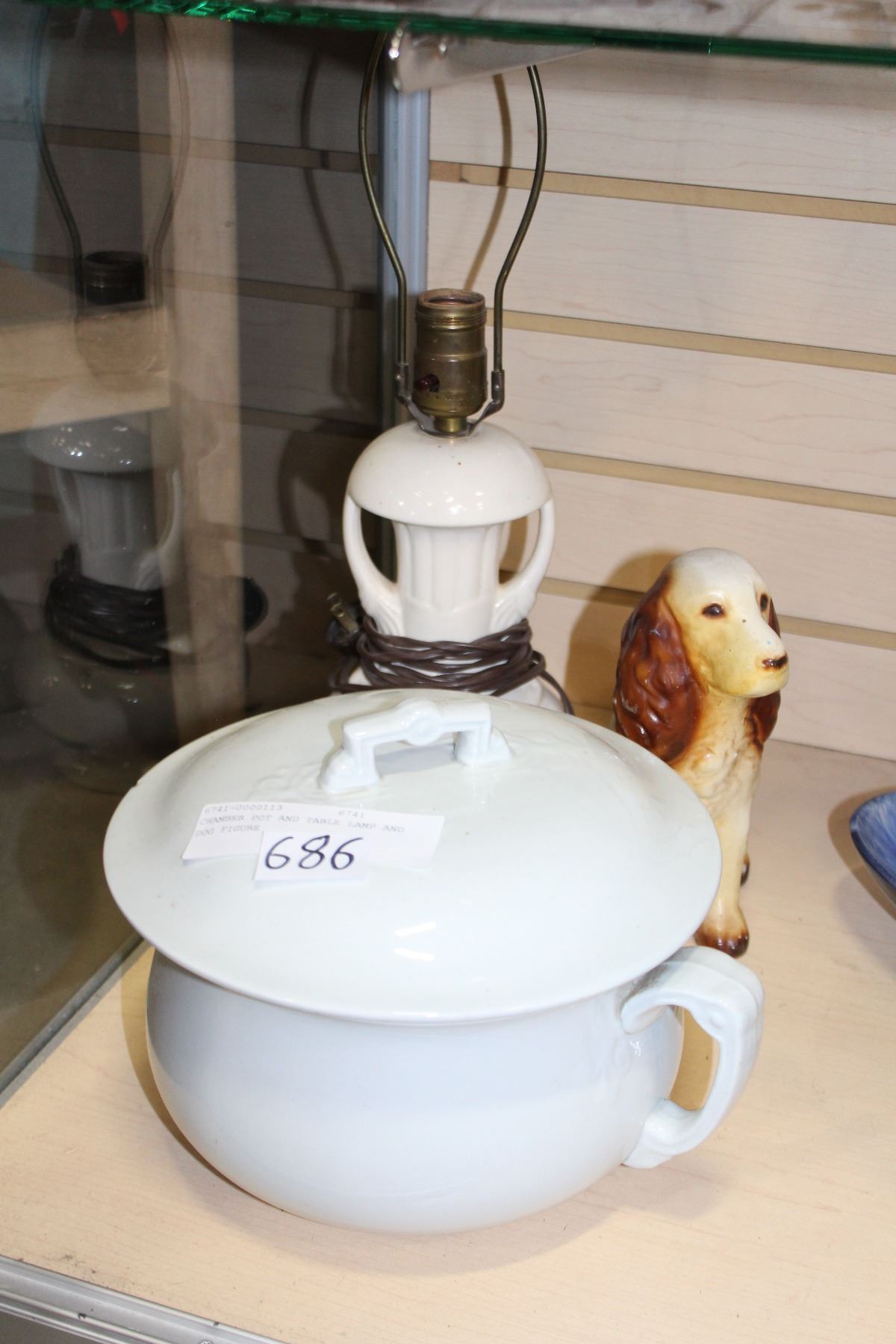 CHAMBER POT AND TABLE LAMP AND DOG FIGURE