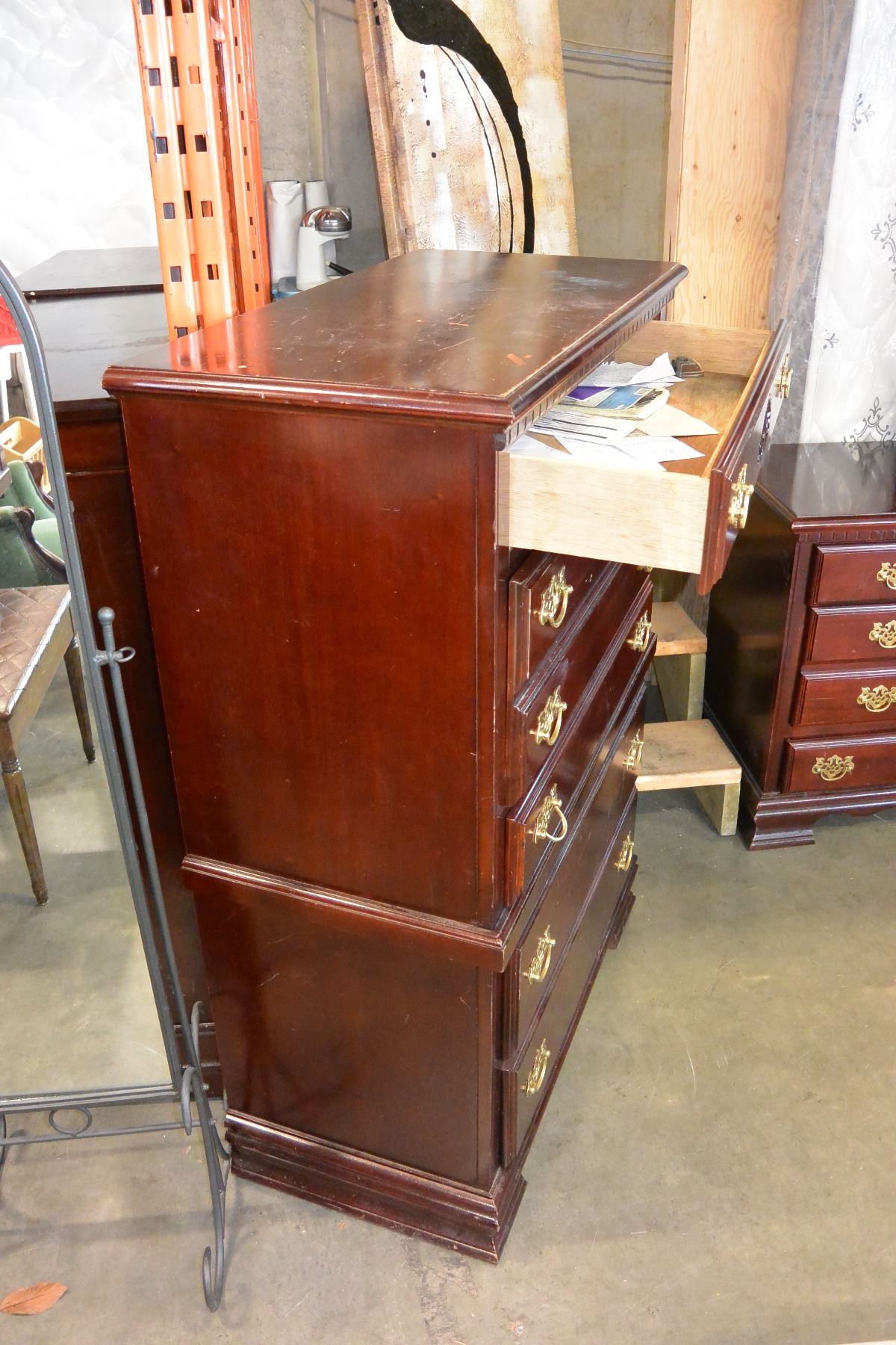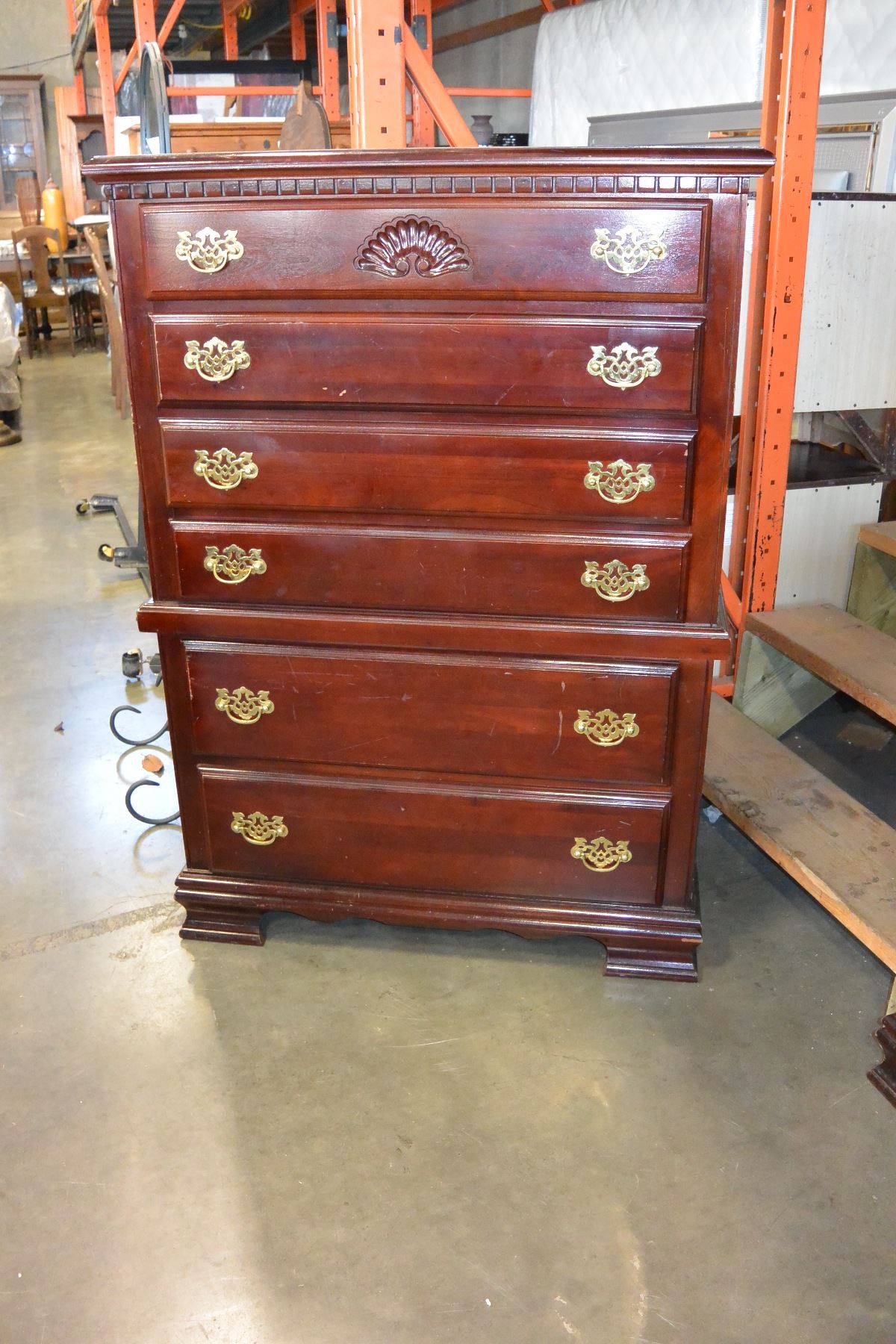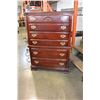 CHERRY FINISH 5 DRAWER CHEST OF DRAWERS WITH BRASS HANDLES