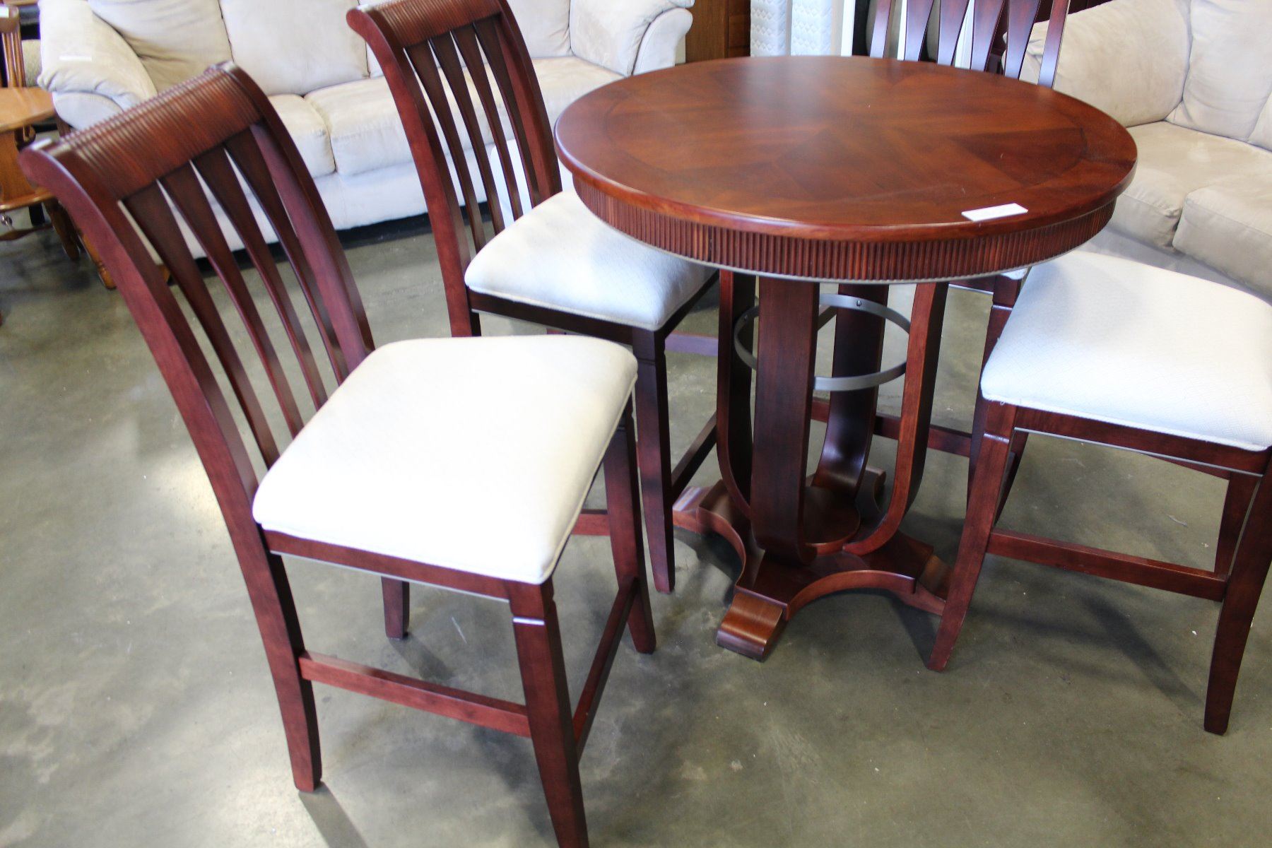 CHERRY FINISH 5 PIECE BAR HEIGHT DINING SET, ROUND TABLE AND UPHOLSTERED SEATS