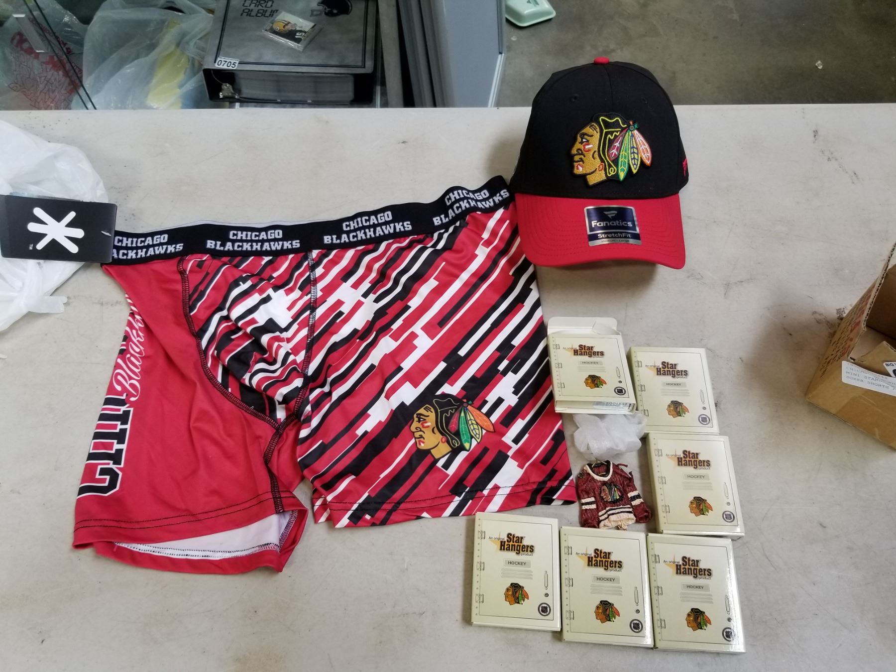 CHICAGO BLACKHAWKS CASE OF 6 MINI STARHANGERS PLUS NEW BOXER SHORTS AND NEW HAT
