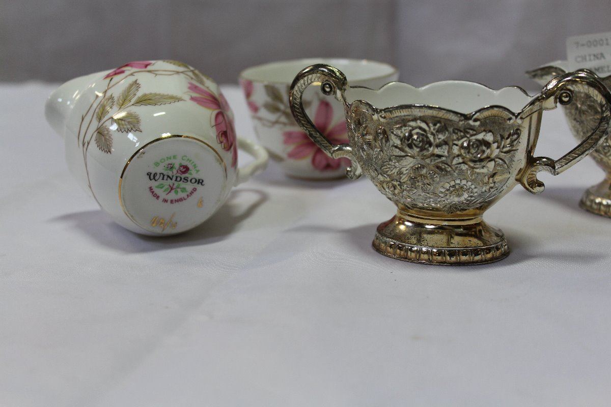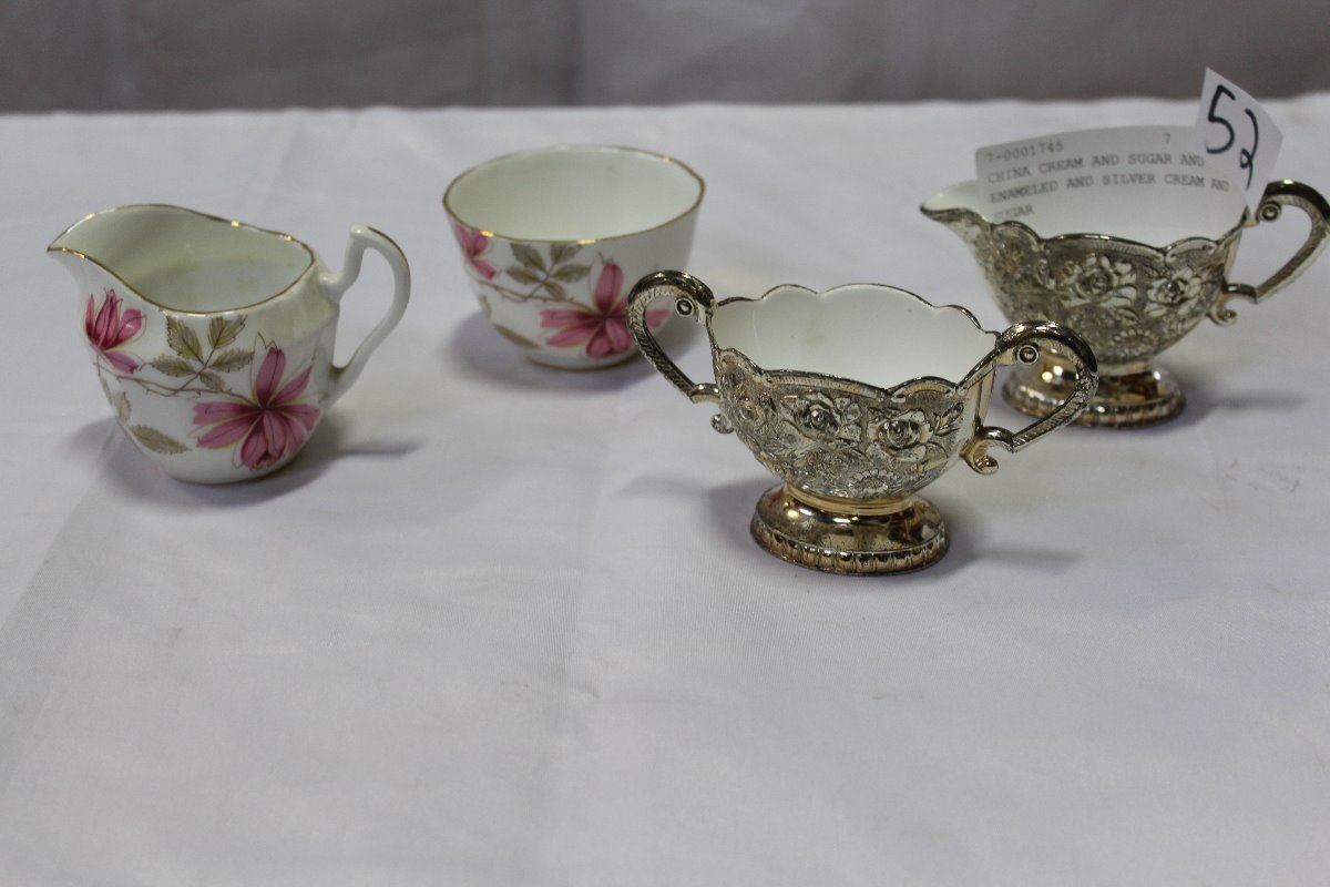 CHINA CREAM AND SUGAR AND ENAMELED AND SILVER CREAM AND