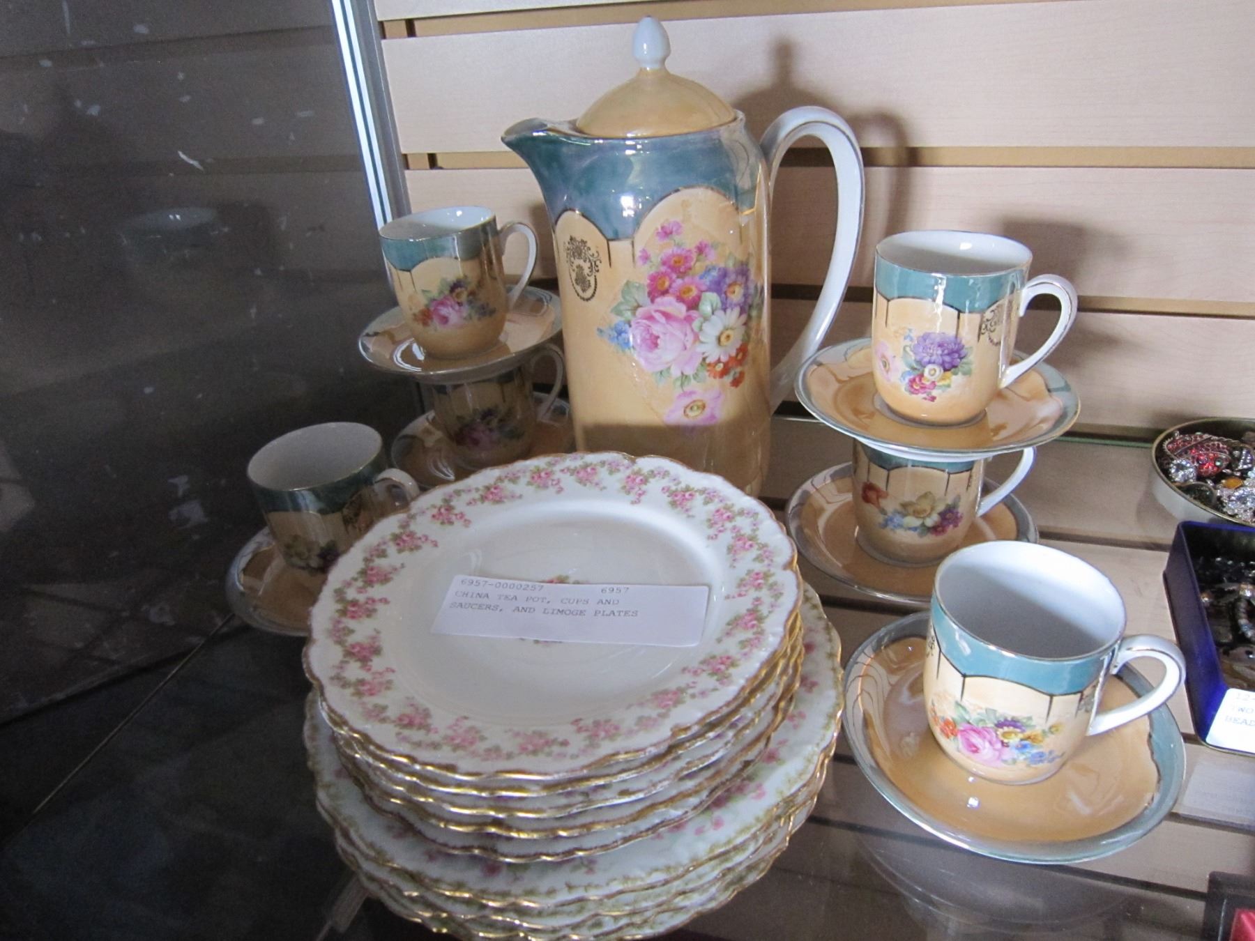 CHINA TEA POT, CUPS AND SAUCERS, AND LIMOGE PLATES