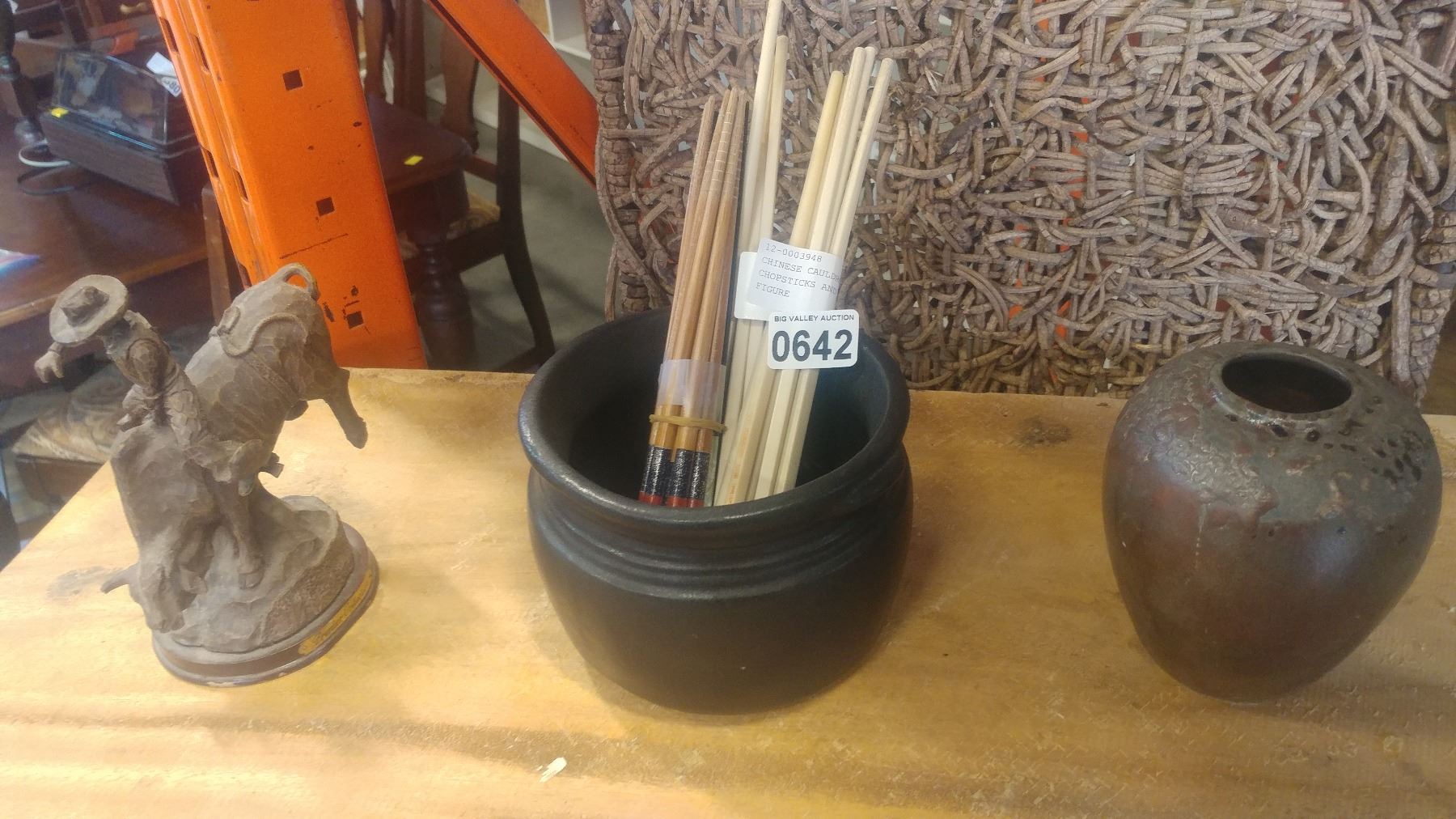 CHINESE CAULDRON WITH CHOPSTICKS AND VASE AND CARVED FIGURE