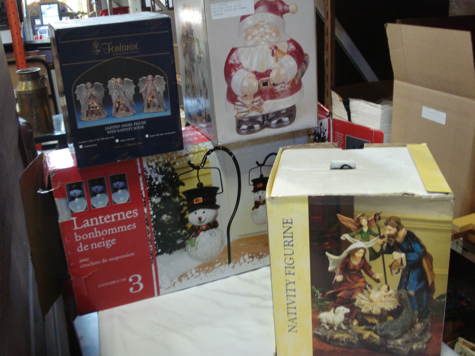 CHRISTMAS COOKIE JAR AND NATIVITY FIGURES AND SNOWMAN LANTERNS