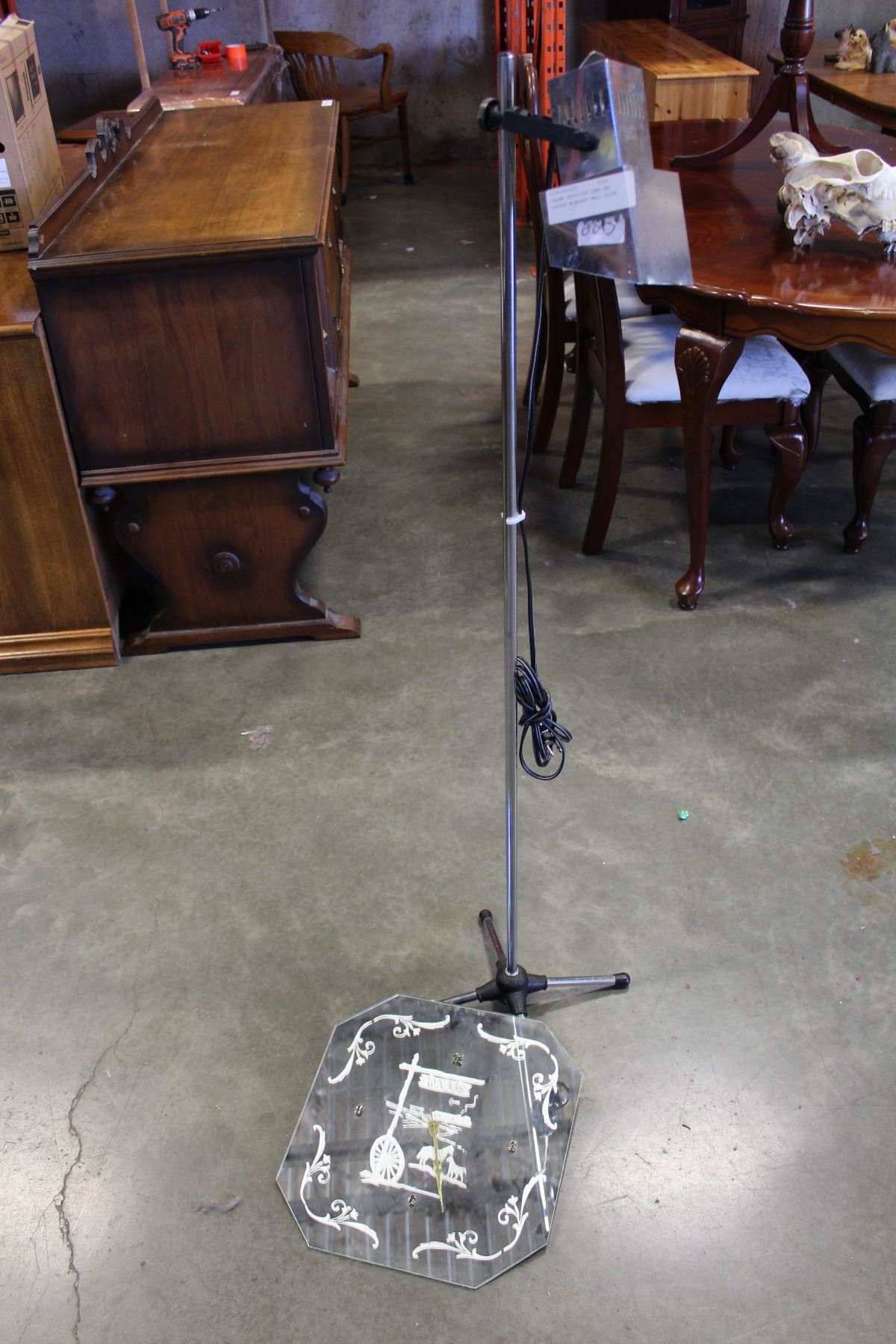CHROME SPOTLIGHT LAMP AND VINTAGE MIRRORED WALL CLOCK